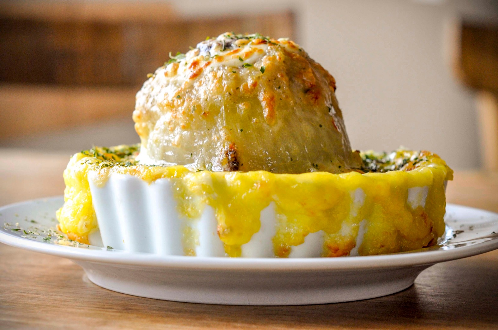 O prato que leva o mesmo nome do restaurante O Bacalhau que Chora é, na verdade, uma cebola recheada de bacalhau e servida com purê de mandioquinha e salsa.