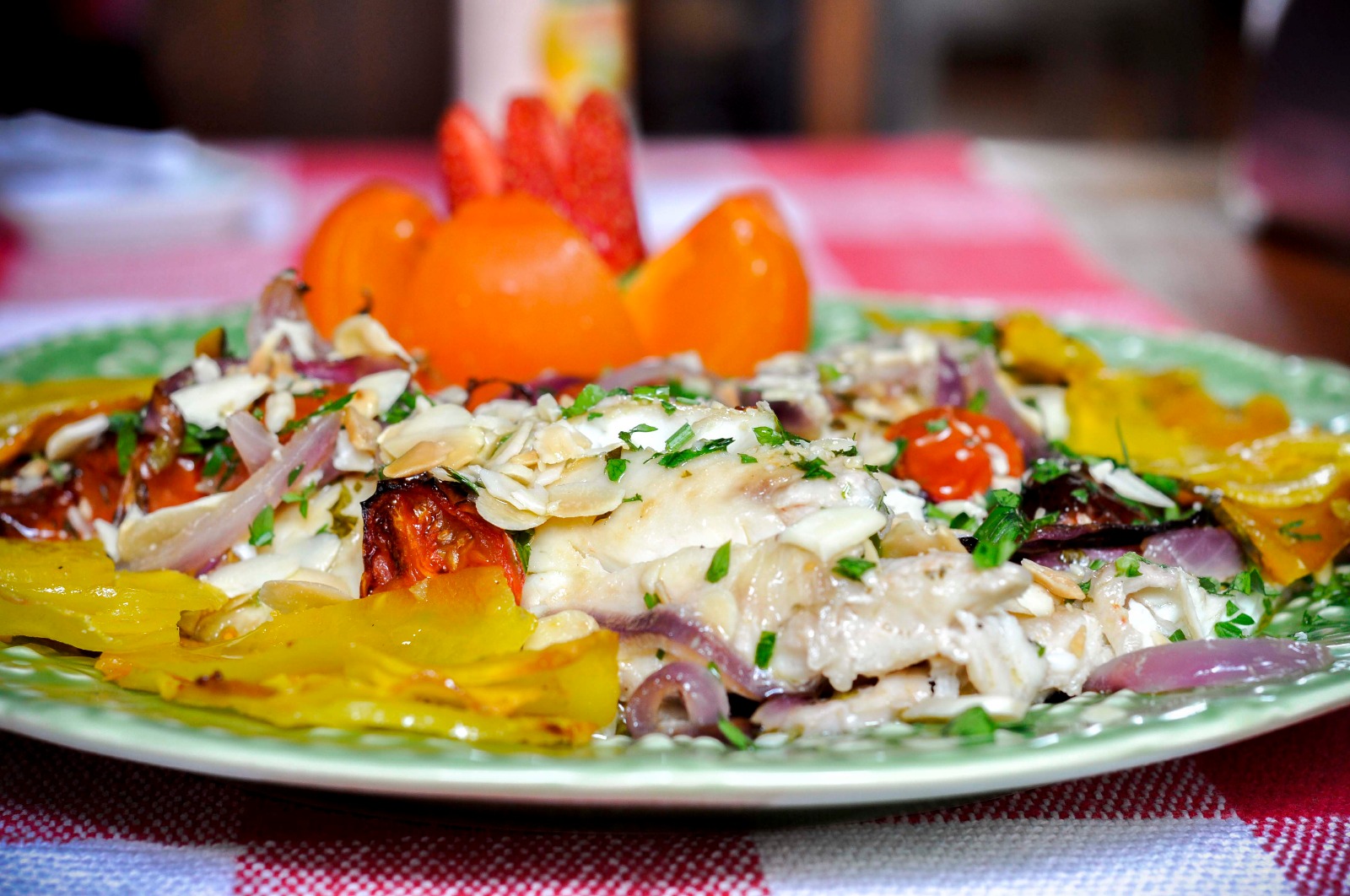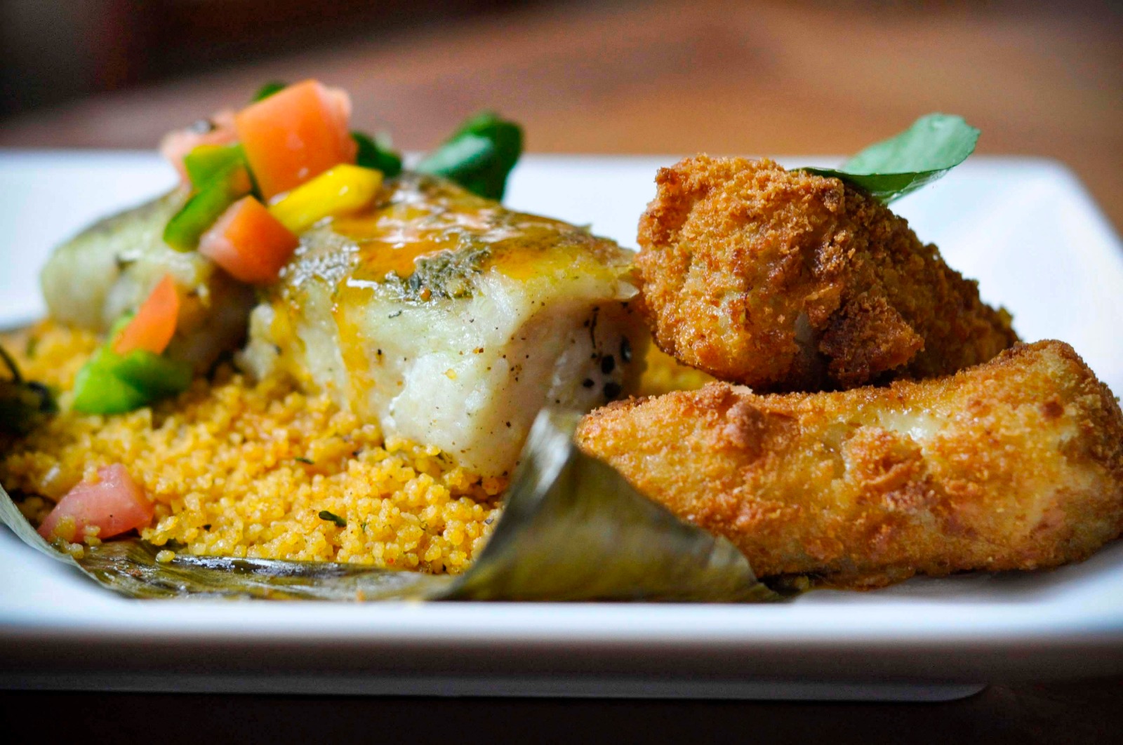 Robalo assado na folha de bananeira com cuscuz marroquino