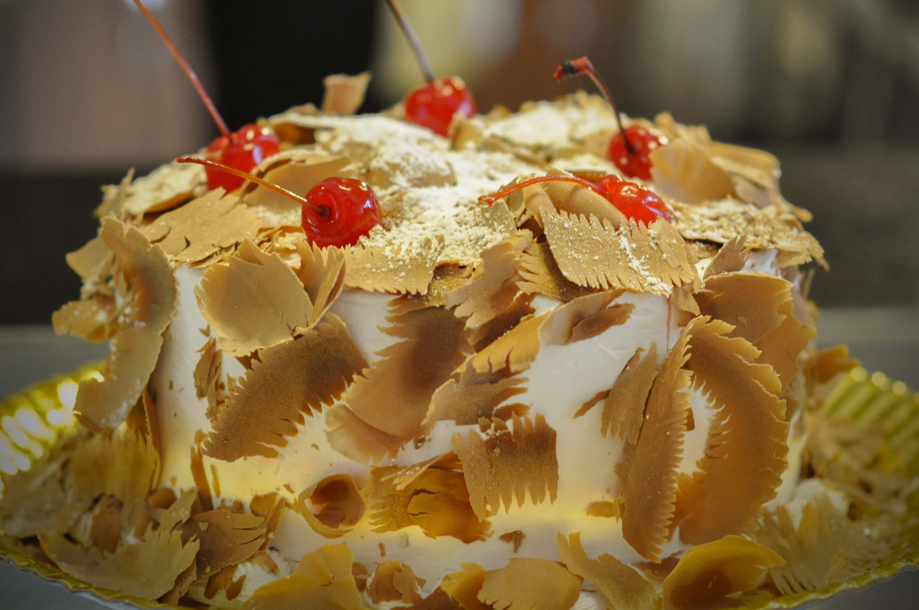 O buffet e café D’Gust tem quatro linhas de bolos confeitados: Tradicional, Chiffon, Especial e Premium. O Floresta Negra faz parte da Chiffon, cuja massa é leve, aerada e mais úmida que o conhecido pão de ló. Além disso, é feita com cacau. Para rechear e cobrir, chantilly e cereja. Raspas de chocolate também vão por cima.