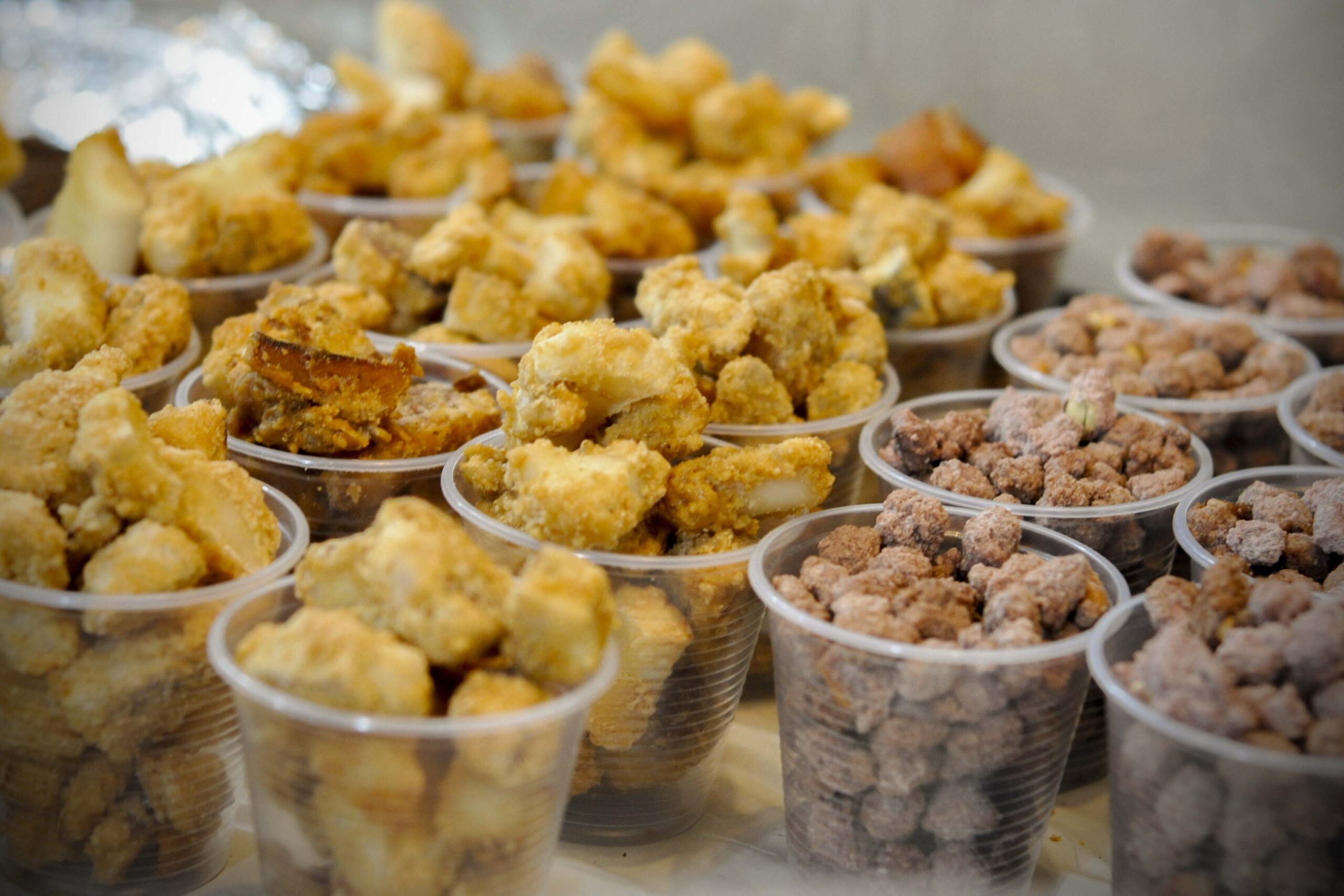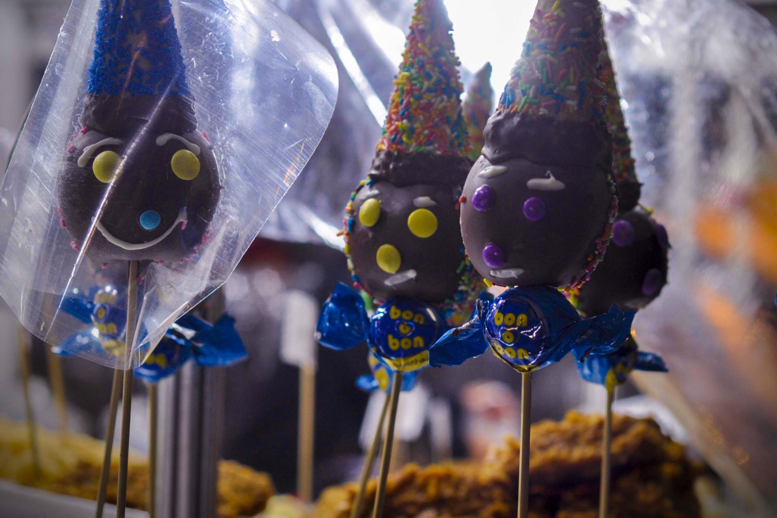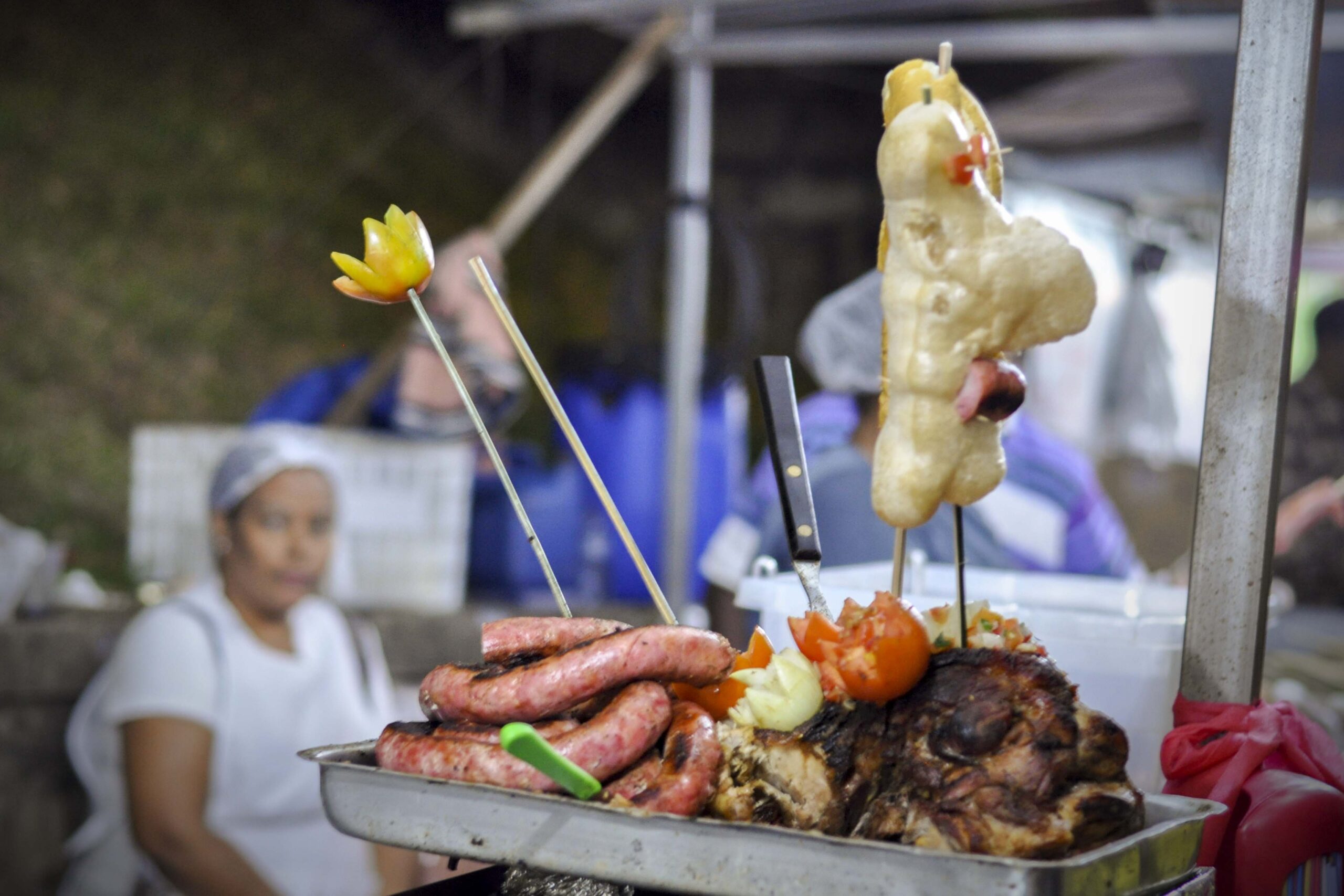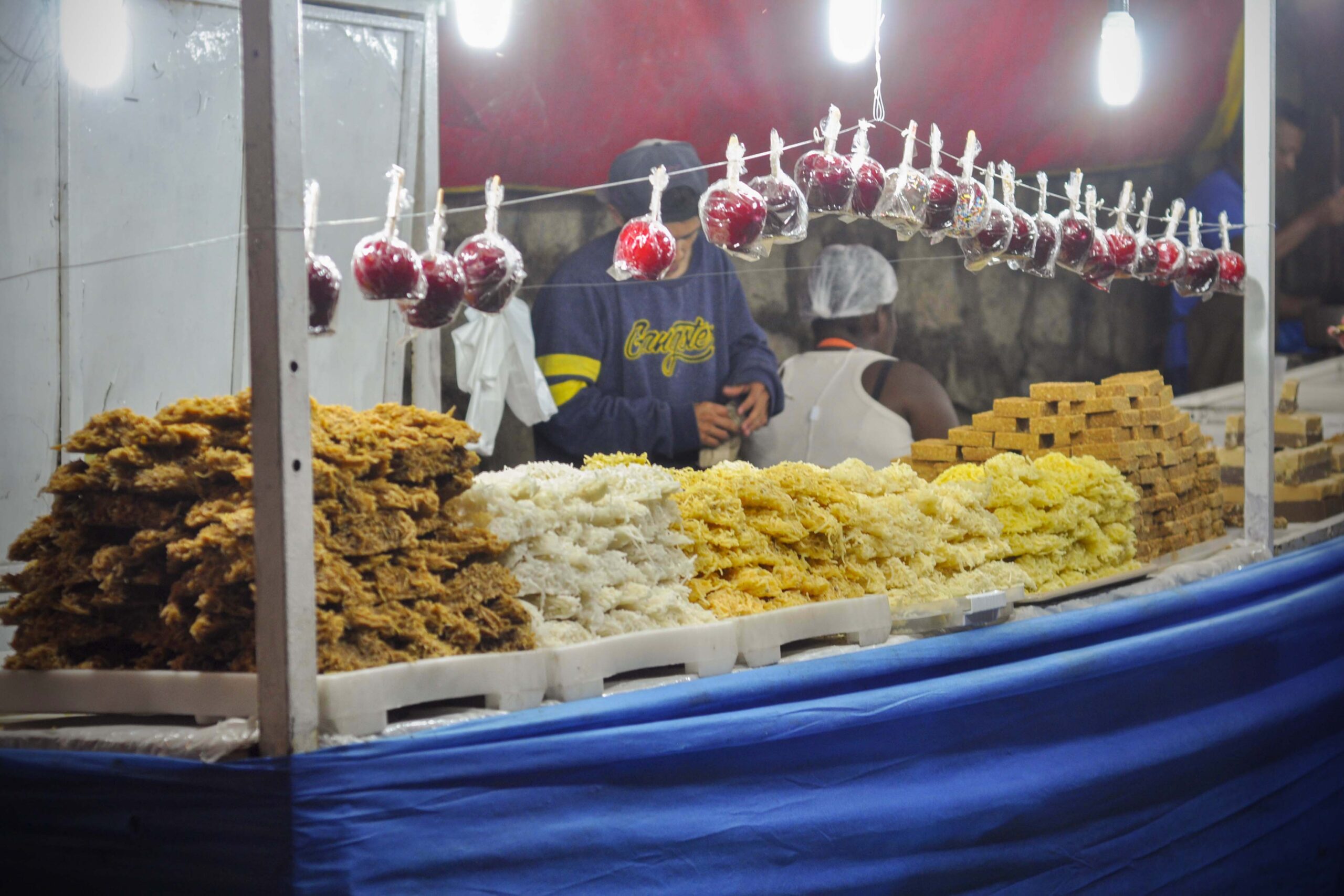 Mas não são só as barracas de doces que fazem sucesso. Dá para matar a fome com suculentos espetinhos de carne e queijo ou até deliciosos lanches de pernil com linguiça.