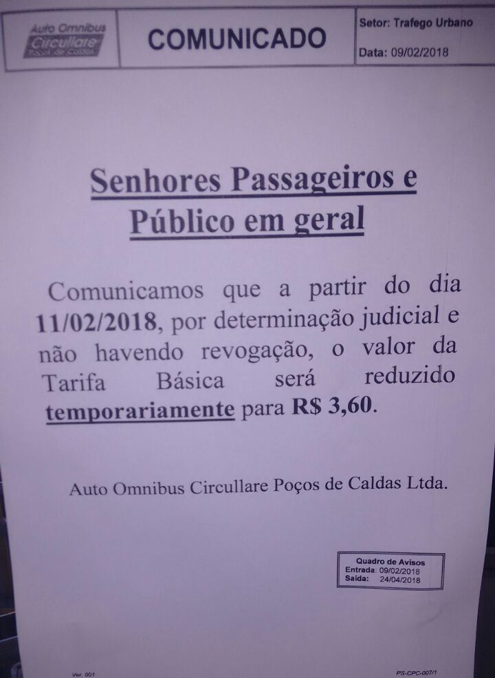 Os funcionários da empresa foram informados da mudança e cartazes foram afixados nos ônibus para o conhecimento da população. A mudança será feita por determinação judicial, caso a empresa não consiga revogá-la. O valor das tarifas das linhas troncal, radial e perimetral passam de R$ 3,80 para R$3,60. Já nas linhas Fazendas o custo caiu R$ 0,40, passando a custar R$ 7,20. As linhas alimentadoras custam R$ 3,00 e as linhas especiais R$ 1,80.