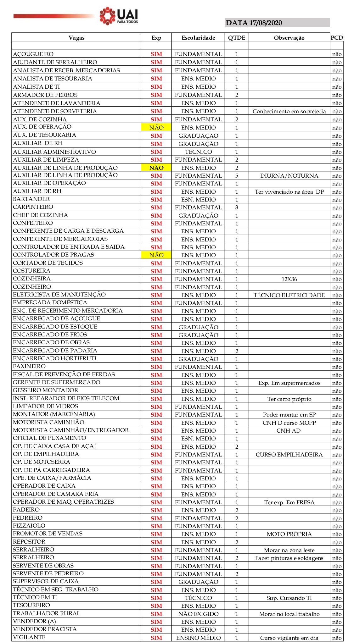 As vagas disponíveis estão no quadro abaixo e podem sofrer alterações ao longo do dia. O Sine fica na rua XV de Novembro, 386.