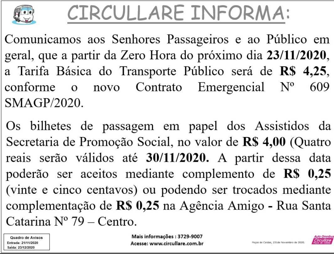A Auto Omnibus Circullare, concessionária de transporte coletivo em Poços de Caldas, anunciou nas redes sociais que a tarifa vai subir para R$ 4,25. O reajuste entra em vigor na segunda-feira (23).