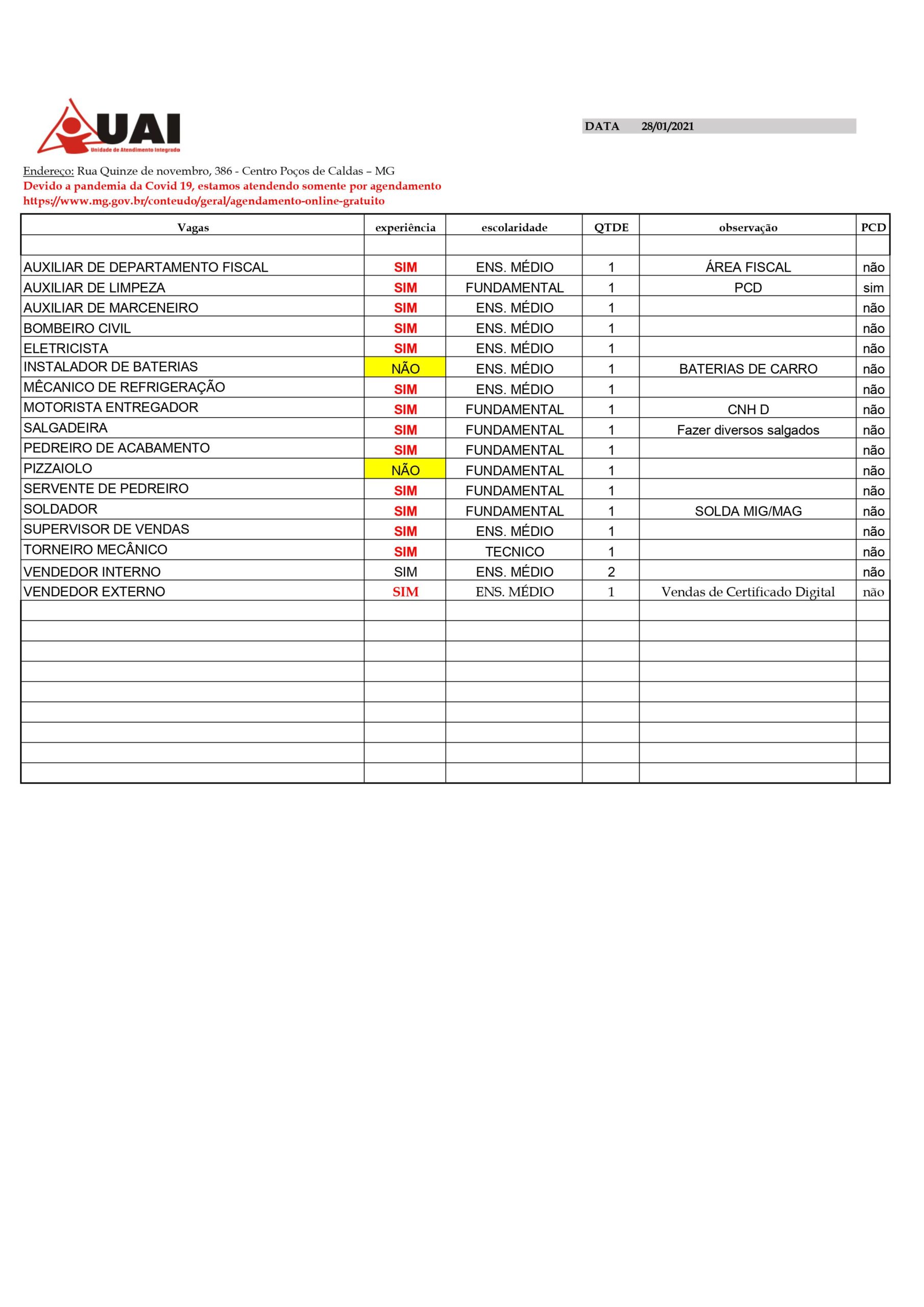 O Sistema Nacional de Empregos (Sine) tem diversas vagas abertas, nesta quinta-feira (28), em Poços de Caldas. Para se inscrever, o candidato deve fazer o agendamento online (clicando aqui).