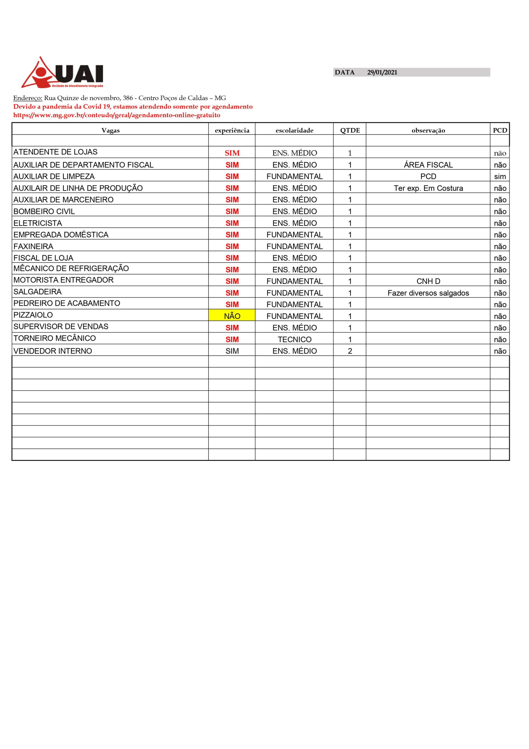 O Sistema Nacional de Empregos (Sine) tem diversas vagas abertas nesta sexta-feira (29), em Poços de Caldas. Para se inscrever, o candidato deve fazer o agendamento online (clicando aqui).