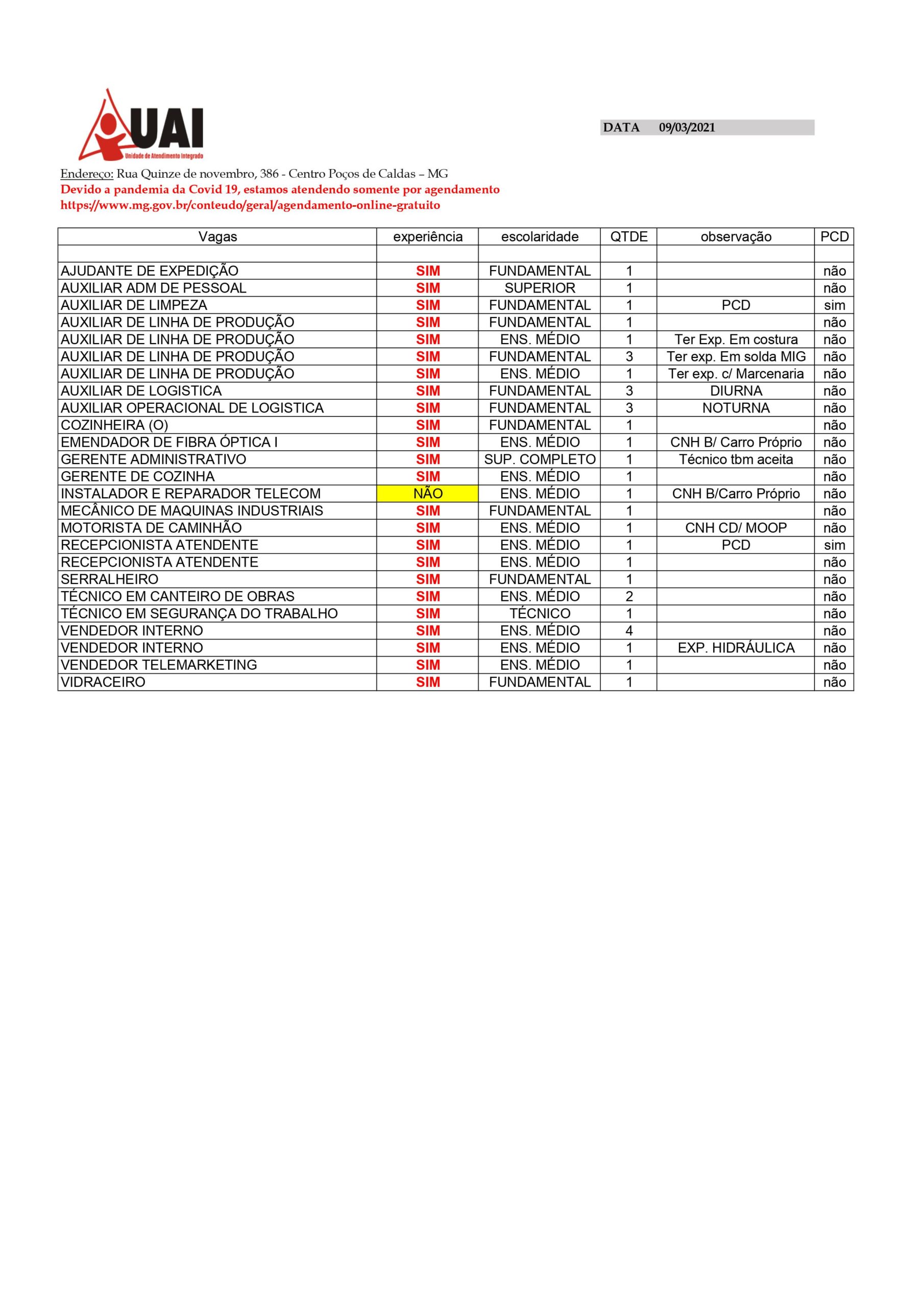 O Sistema Nacional de Empregos (Sine) em Poços de Caldas tem diversas vagas abertas nesta terça-feira (9). Para se inscrever, o candidato deve fazer o agendamento online (clicando aqui).