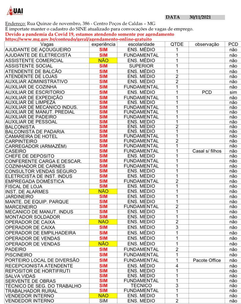 O Sistema Nacional de Empregos (Sine) tem mais de 60 vagas abertas nesta terça-feira (30), em Poços de Caldas. Para se inscrever, o candidato deve fazer o agendamento online (clicando aqui).