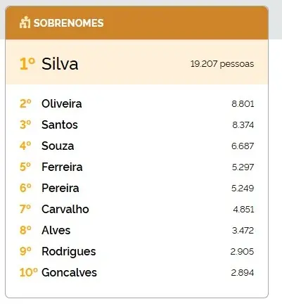Em seguida, aparecem os sobrenomes Santos, com 21,4 milhões de pessoas (10,5%), e Oliveira, com 11,7 milhões. O ranking continua com Souza, Pereira e Ferreira, respectivamente.