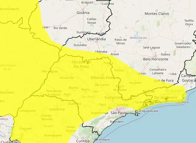 De acordo com o primeiro alerta, válido até as 18h desta sexta-feira (14), a população deve se preparar para chuva. A previsão é entre 20 e 30 mm/h, com ventos de 40 a 60 km/h e possível queda de granizo. Embora o risco seja considerado baixo, podem ocorrer cortes de energia elétrica, danos a plantações, queda de galhos de árvores e alagamentos.
