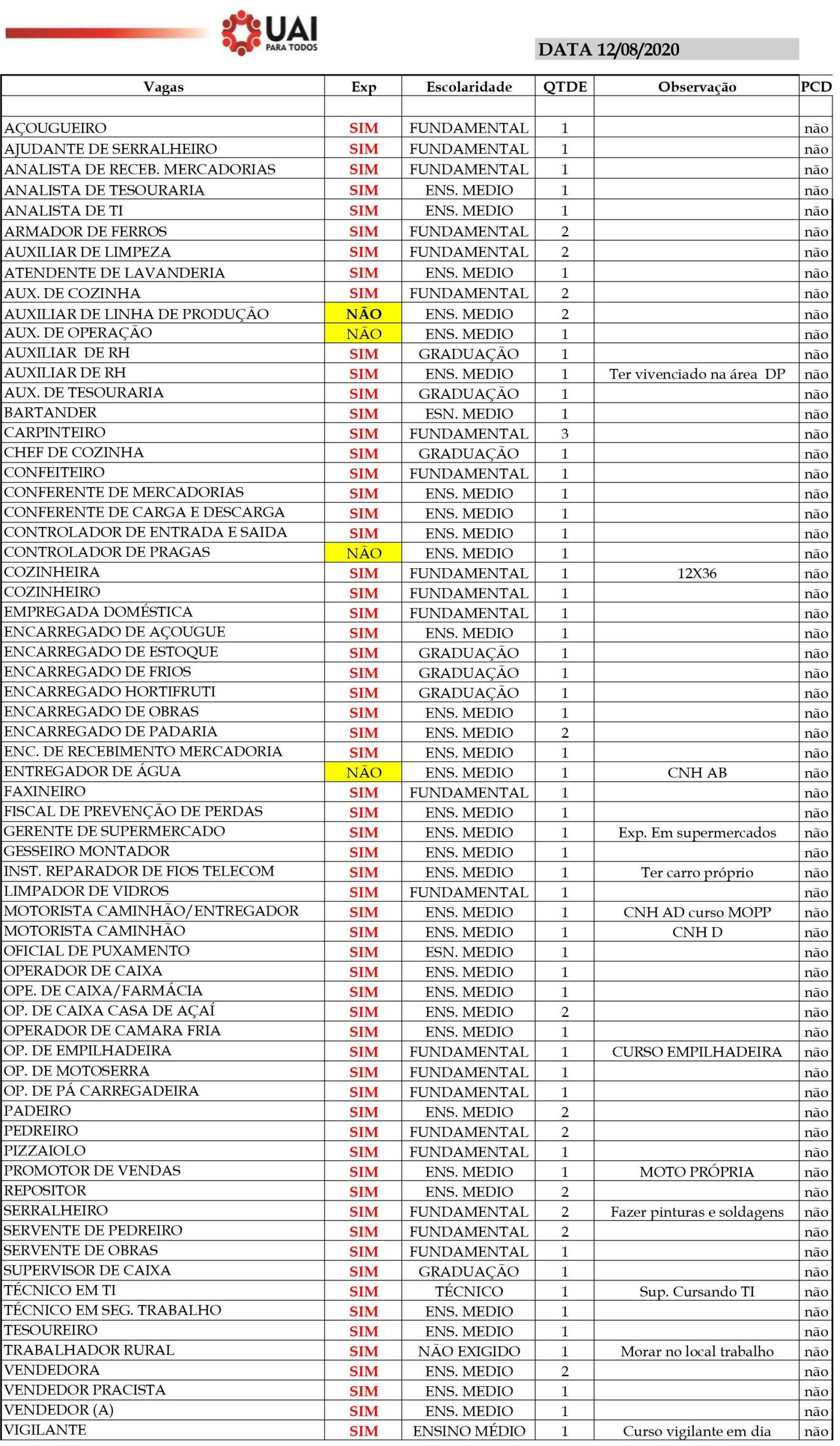 As vagas disponíveis estão no quadro abaixo e podem sofrer alterações ao longo do dia. O Sine fica na rua XV de Novembro, 386.