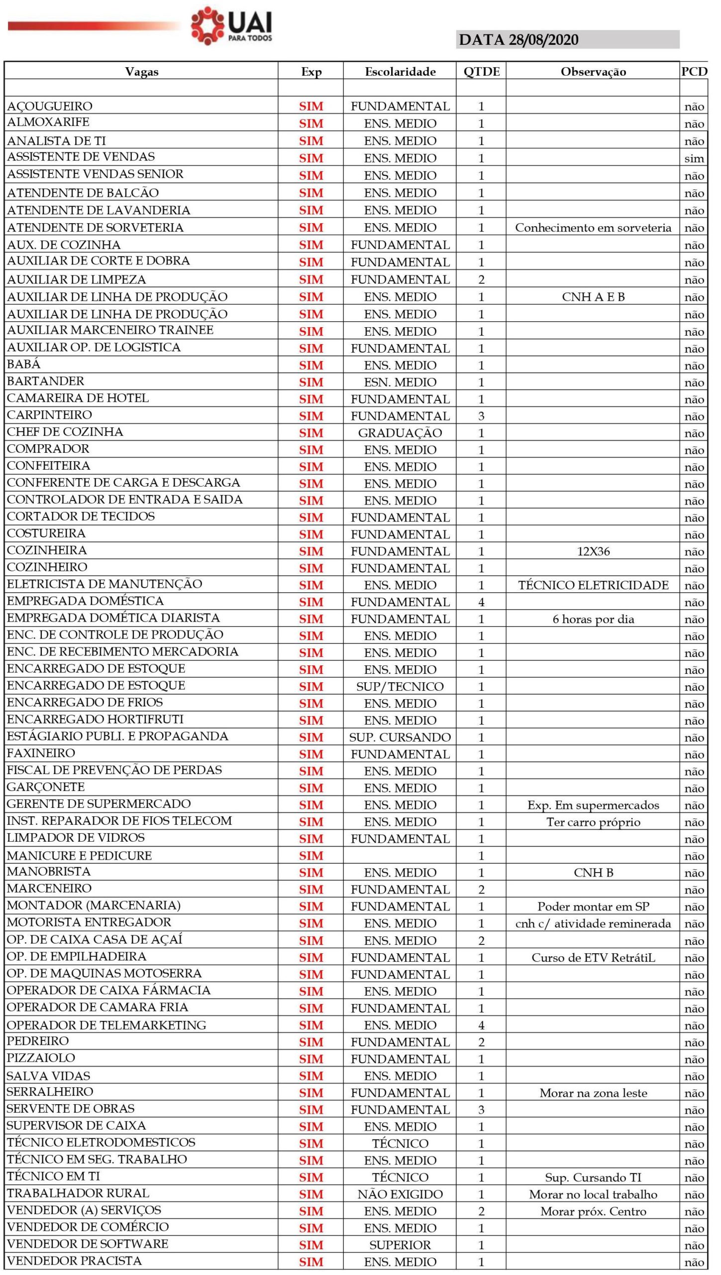 As vagas disponíveis estão no quadro abaixo e podem sofrer alterações ao longo do dia. O Sine fica na rua XV de Novembro, 386.
