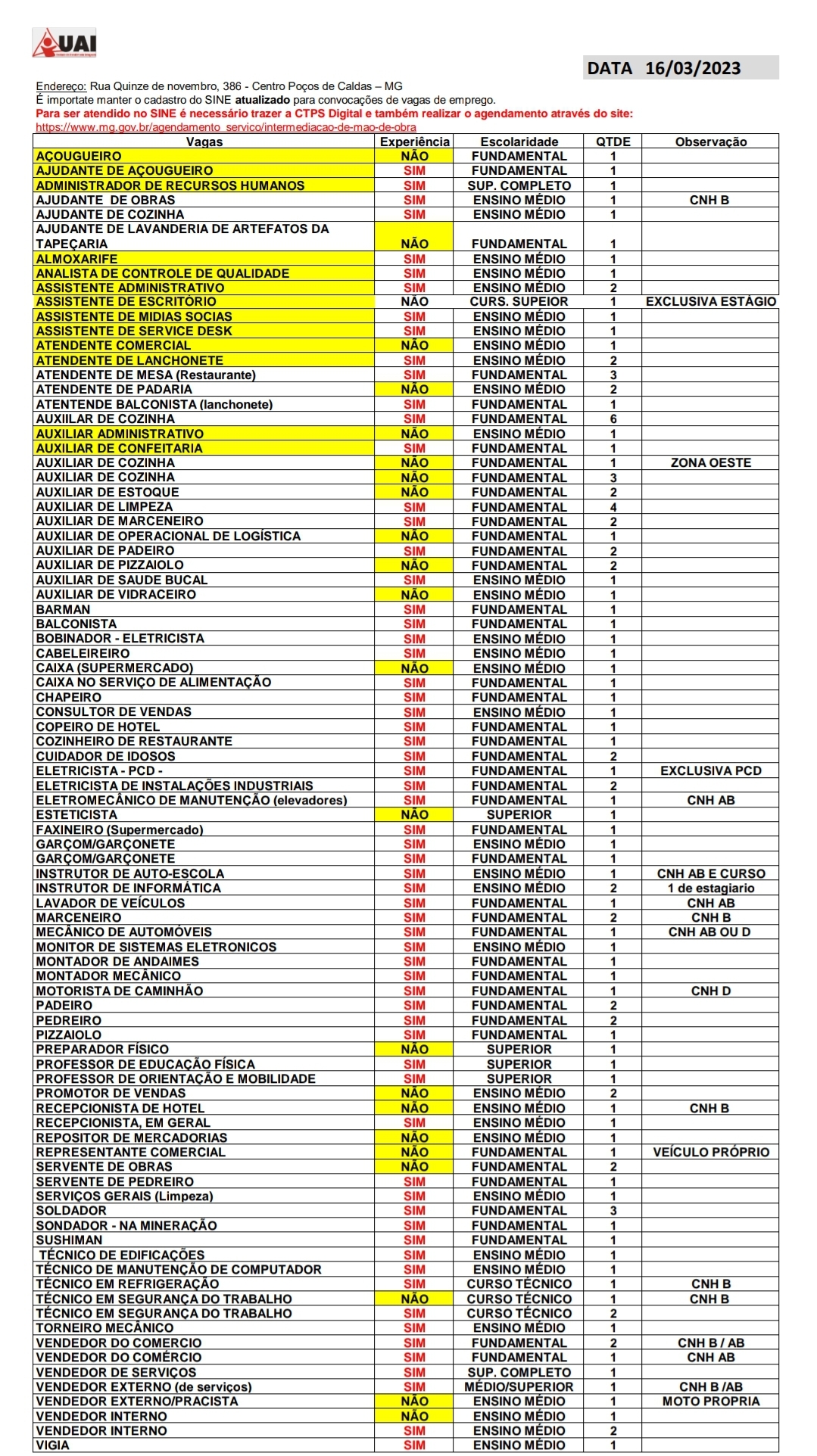 O Sistema Nacional de Empregos (Sine) tem diversas vagas cadastradas para Poços de Caldas nesta quinta-feira (16). Para se inscrever, o candidato deve fazer o agendamento online (clicando aqui).