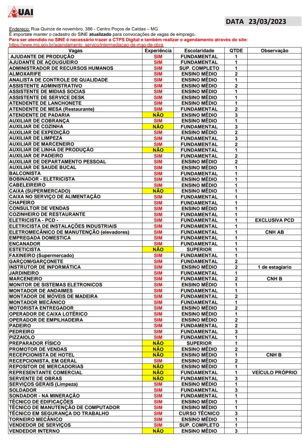 O Sistema Nacional de Empregos (Sine) tem diversas vagas cadastradas para Poços de Caldas nesta quinta-feira (23). Para se inscrever, o candidato deve fazer o agendamento online (clicando aqui).