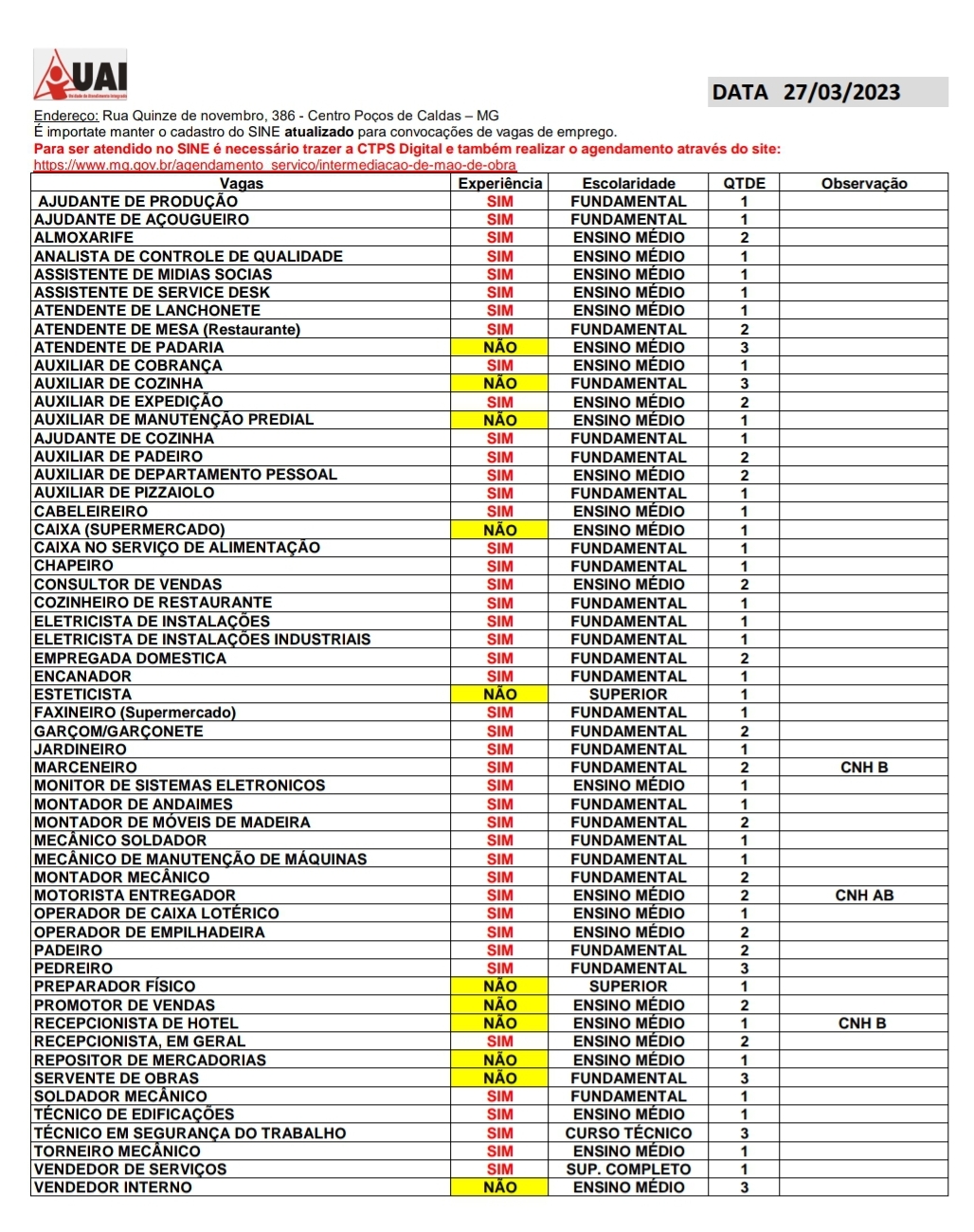 O Sistema Nacional de Empregos (Sine) tem diversas vagas cadastradas para Poços de Caldas nesta segunda-feira (27). Para se inscrever, o candidato deve fazer o agendamento online (clicando aqui).