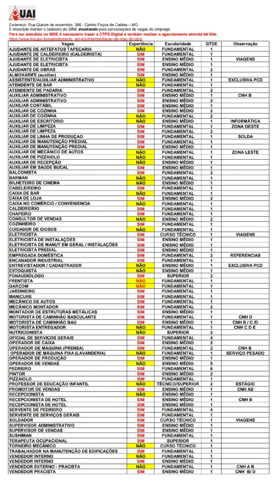 O Sistema Nacional de Empregos (Sine) tem diversas vagas cadastradas para Poços de Caldas nesta terça-feira (23). Para se inscrever, o candidato deve fazer o agendamento online (clicando aqui).