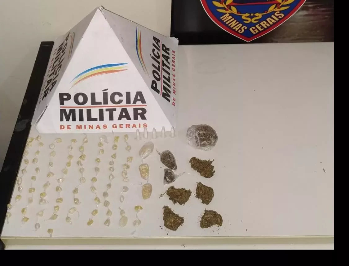 No local onde ele estava foram arrecadados dinheiro, 84 pedras de crack, três pedras brutas de crack, um tablete de maconha, cinco porções de maconha, duas porções de haxixe e cinco pinos de cocaína.