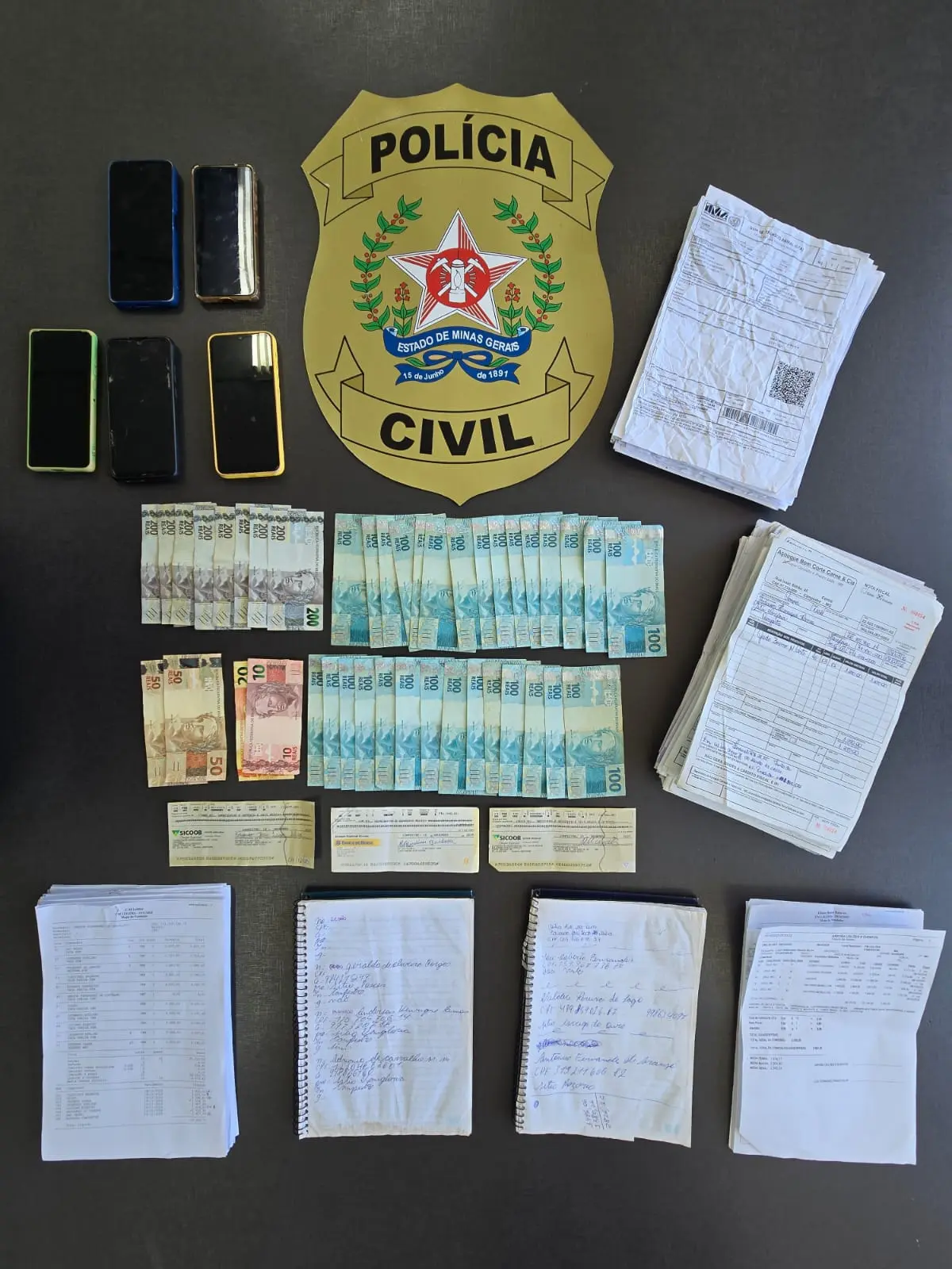 Durante as buscas, os policiais apreenderam 14 cabeças de gado em um leilão local. Os animais não tinham comprovação de origem ou propriedade. Além disso, a apreensão incluiu diversos aparelhos celulares, documentos como GTAs e notas fiscais, cadernos com anotações, cheques e aproximadamente R$ 5 mil em espécie.