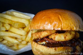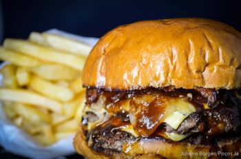 Pão, hambúrguer, queijo prato, bacon, onion rings, barbecue e geleia de bacon (R$ 22,90 simples e R$ 27,90 duplo).
