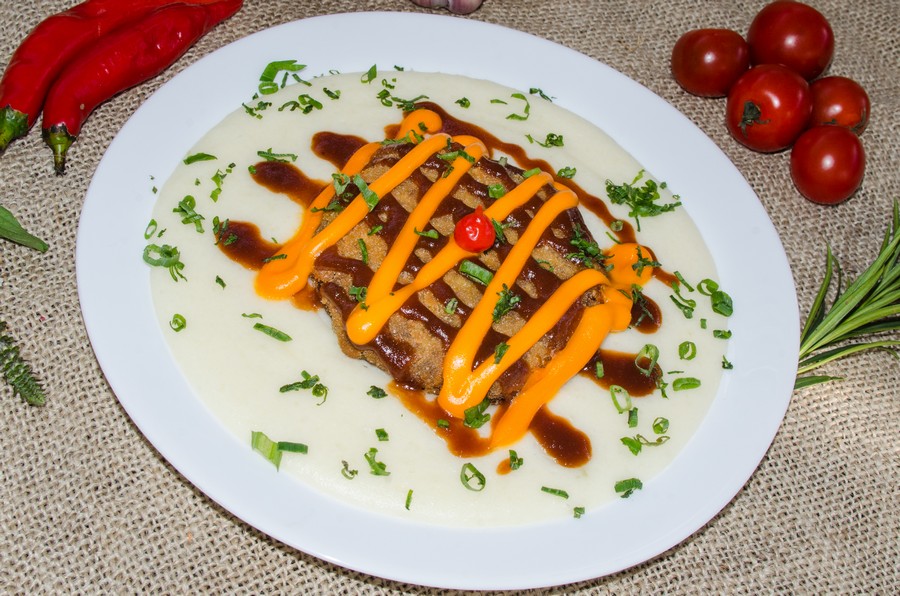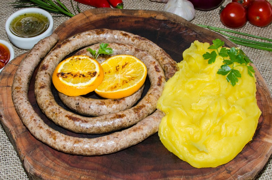 Linguiça de costela grelhada com creme de mandioquinha salsa.