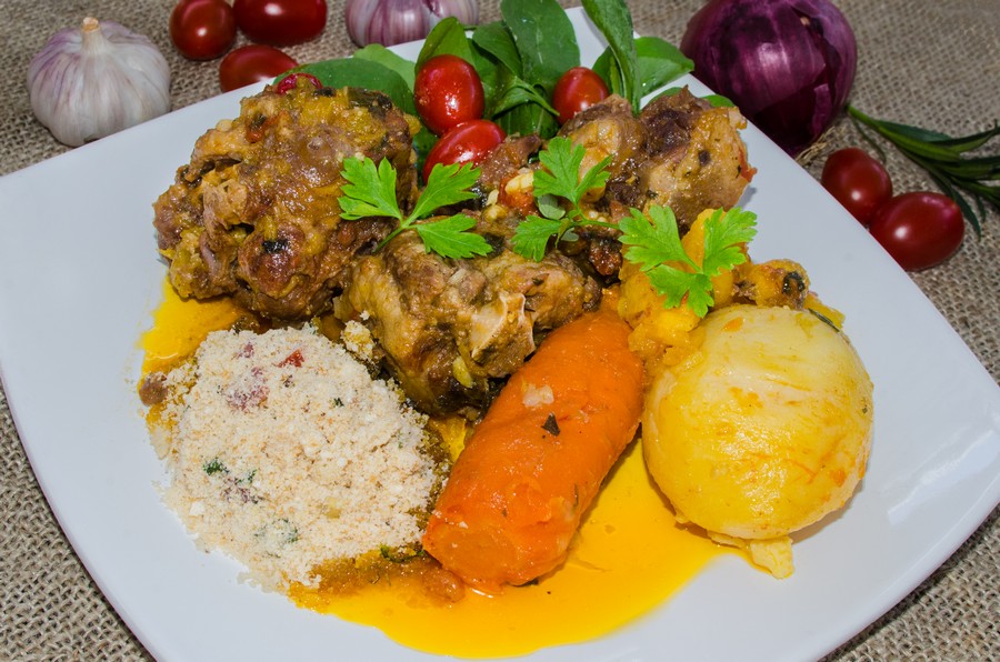 Carne de porco guardada na gordura com cenoura e mandioca.