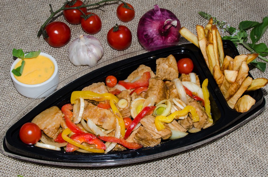 Filé mignon suíno na chapa com cebola, tomate, mandioquinha salsa, cenoura em cubos, ervilha e alho frito. Misturada e temperada com vinho branco, shoyo e pimenta calabresa.