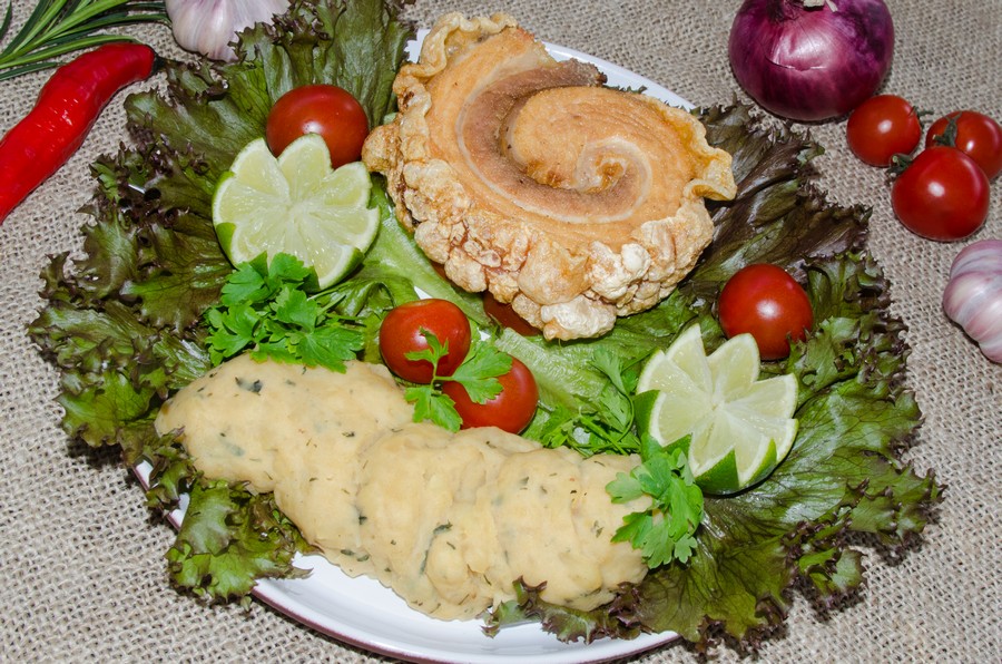 Panqueca de peixe ao molho especial. Acompanha chips de batata baroa.