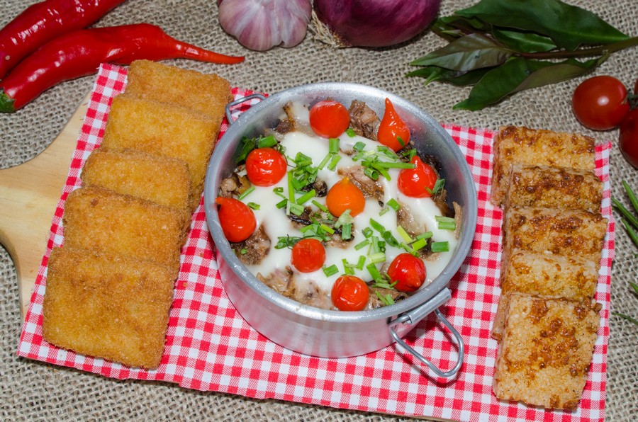 Cubos de pernil ao molho de cerveja preta e creme de cebola, acompanhado de mandioca, batata doce fritas e geleia de pimenta.