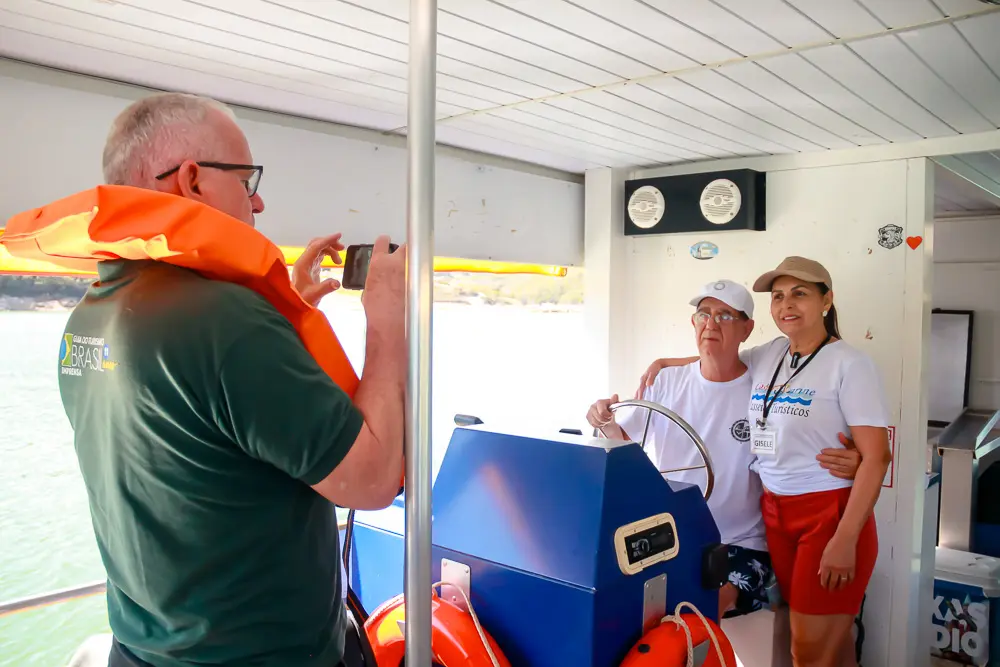 A capacidade é de 28 pessoas sentadas, mais duas na tripulação. “É inesquecível navegar aqui no Mar de Minas e aproveitar esse pedacinho do céu”, resume Gisele.