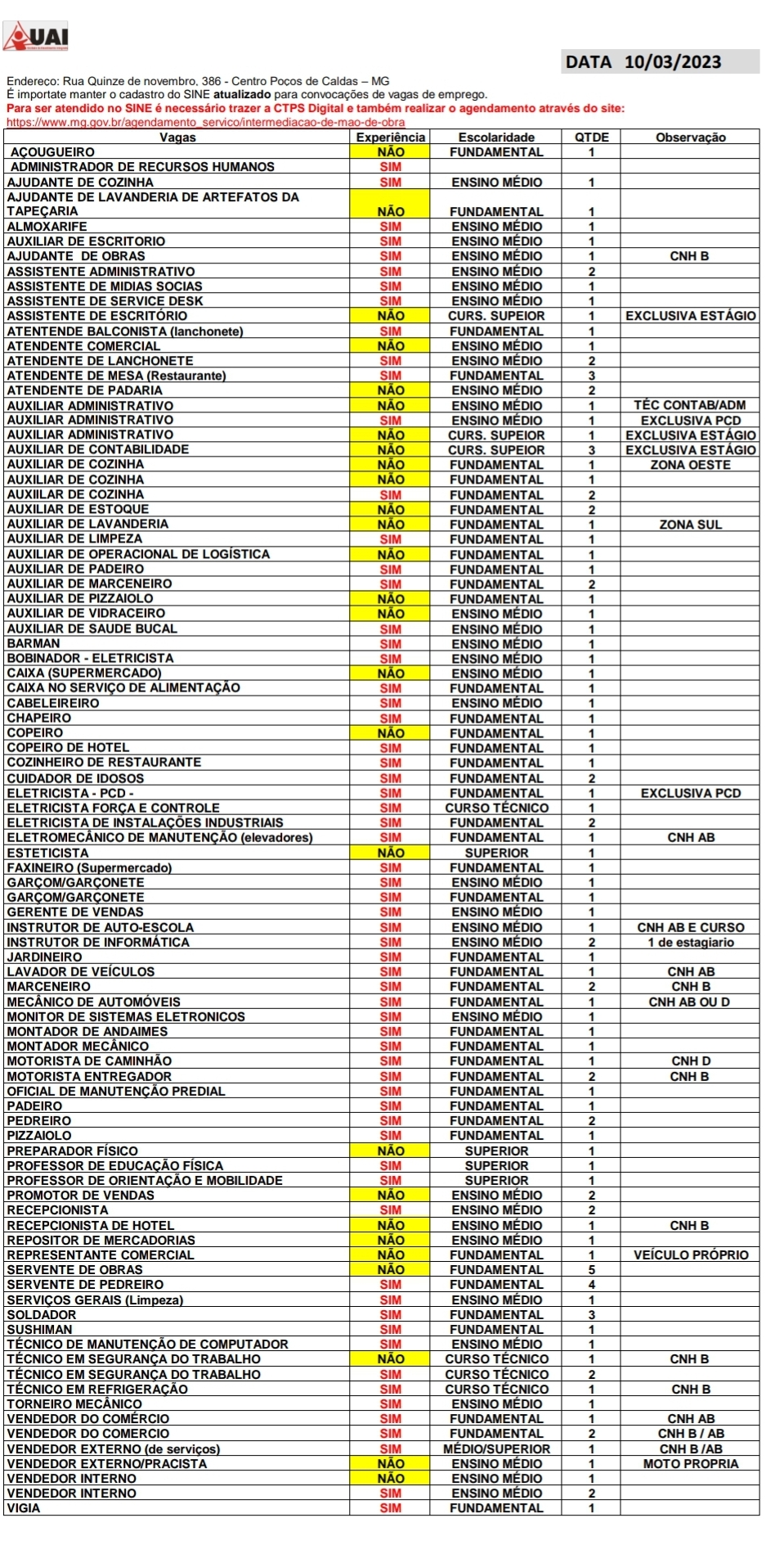As vagas disponíveis estão no quadro abaixo e podem sofrer alterações ao longo do dia. O Sine fica na rua XV de Novembro, 386.