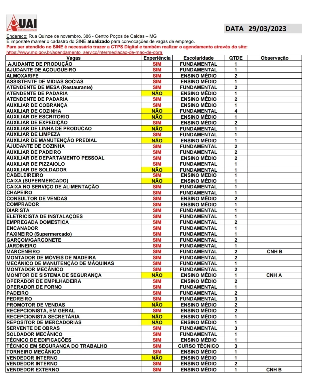 O Sistema Nacional de Empregos (Sine) tem 80 vagas cadastradas para Poços de Caldas nesta quarta-feira (29). Para se inscrever, o candidato deve fazer o agendamento online (clicando aqui).
