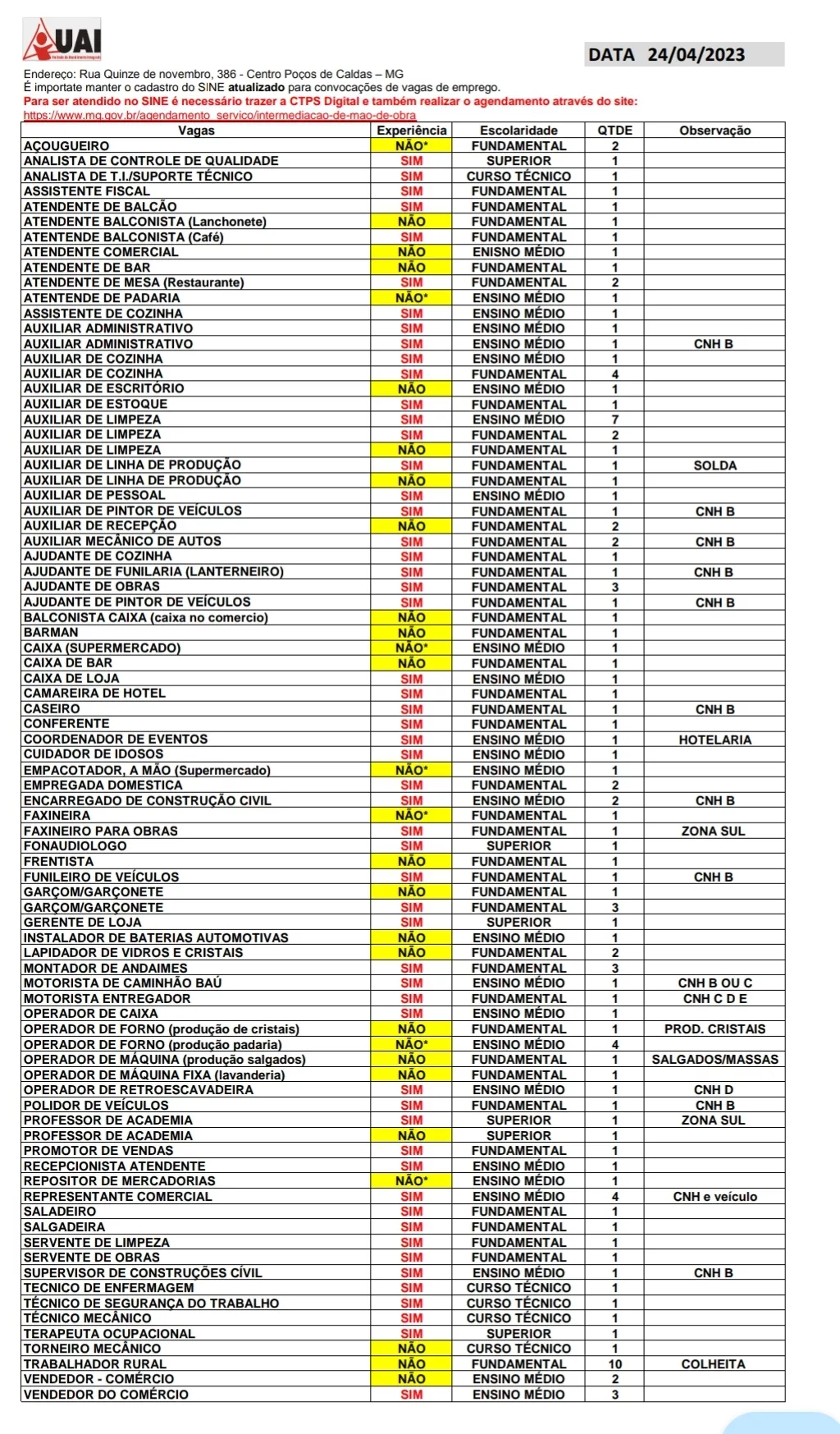 O Sistema Nacional de Empregos (Sine) tem diversas vagas cadastradas para Poços de Caldas nesta segunda-feira (24). Para se inscrever, o candidato deve fazer o agendamento online (clicando aqui).