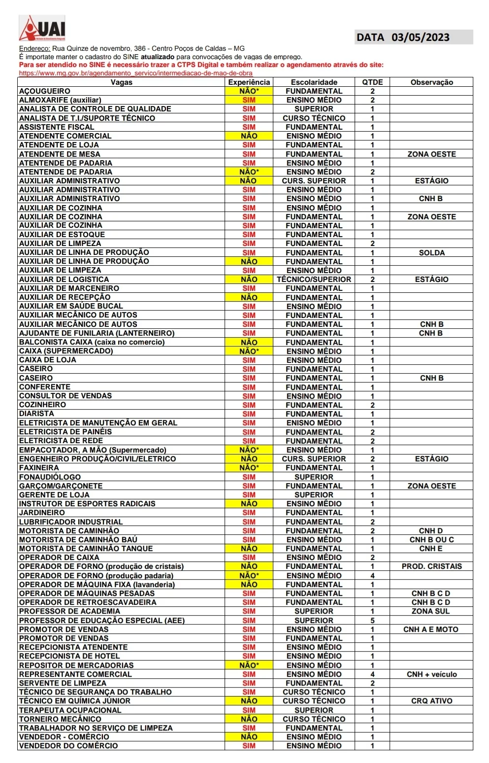O Sistema Nacional de Empregos (Sine) tem diversas vagas cadastradas para Poços de Caldas nesta quarta-feira (3). Para se inscrever, o candidato deve fazer o agendamento online (clicando aqui).
