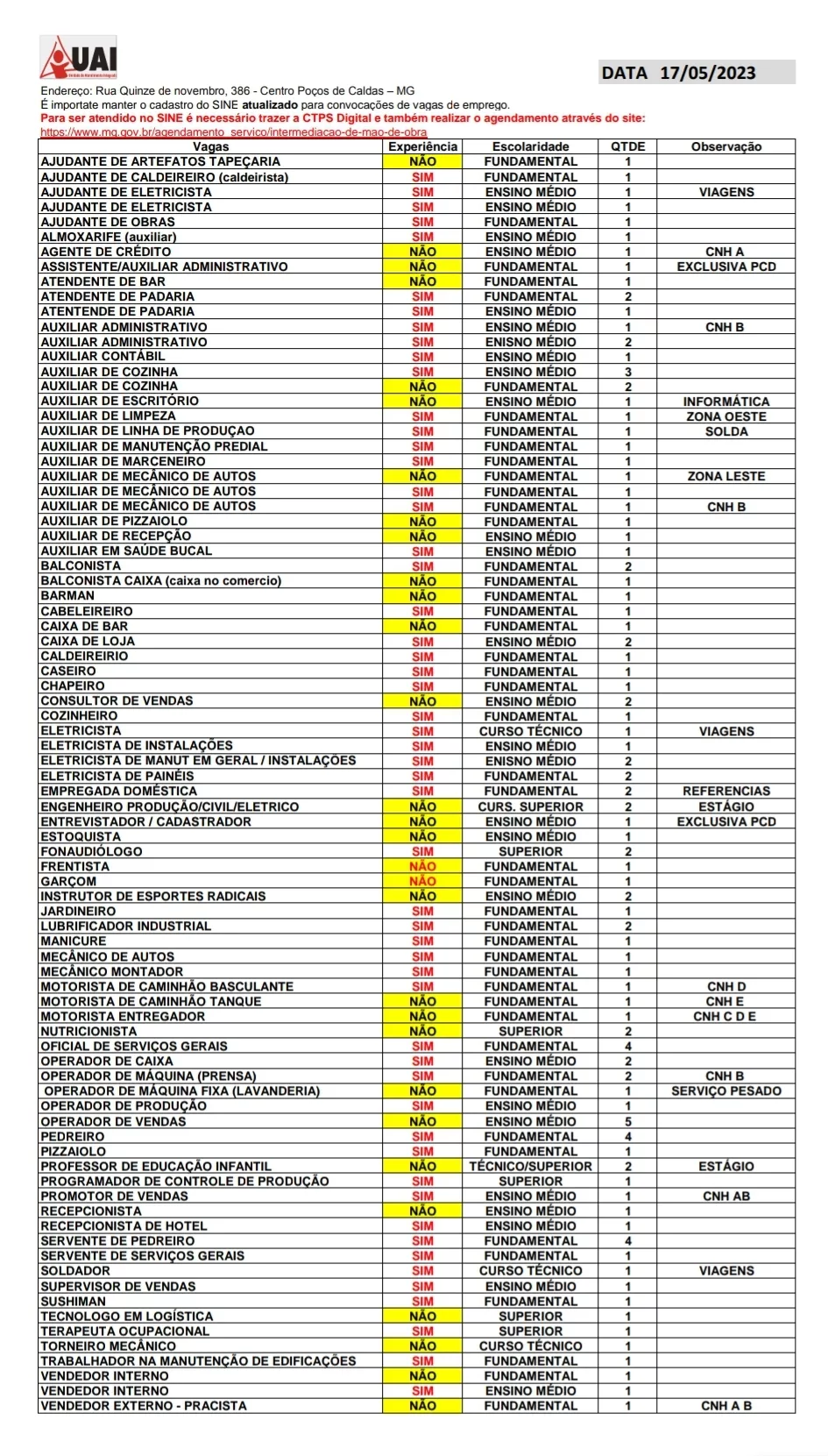 O Sistema Nacional de Empregos (Sine) tem diversas vagas cadastradas para Poços de Caldas nesta quarta-feira (17). Para se inscrever, o candidato deve fazer o agendamento online (clicando aqui).