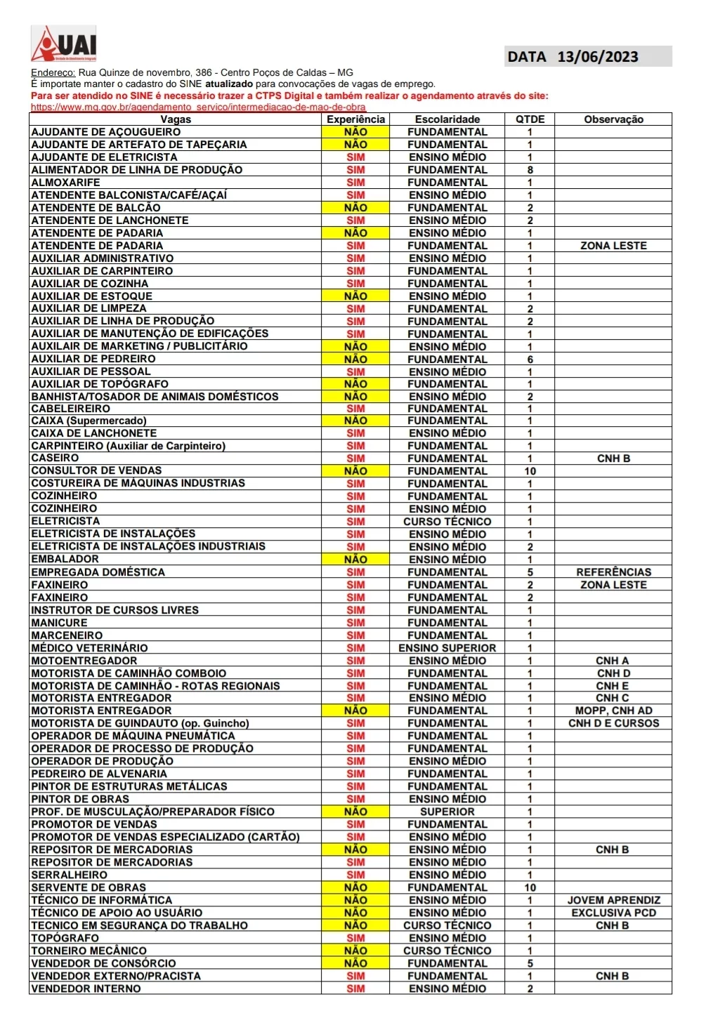 O Sistema Nacional de Empregos (Sine) tem diversas vagas cadastradas para Poços de Caldas nesta terça-feira (13). Para se inscrever, o candidato deve fazer o agendamento online (clicando aqui).