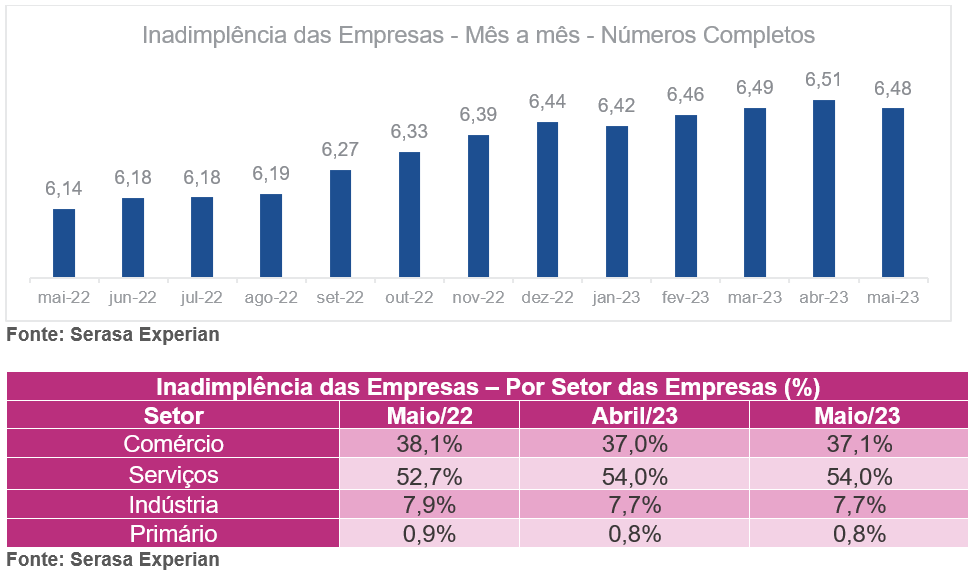 Na análise nacional, foram registradas 6,48 milhões de empresas inadimplentes no Brasil, uma queda de 28,8 mil companhias em relação a abril de 2023, mês em que um novo recorde da série histórica do Indicador de Inadimplência das Empresas da Serasa Experian foi registrado. A maioria das empresas negativadas eram do setor de Serviços (54%).