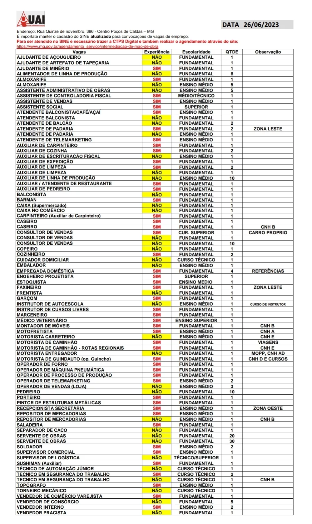 As vagas disponíveis estão no quadro abaixo e podem sofrer alterações ao longo do dia. O Sine fica na rua XV de Novembro, 386.