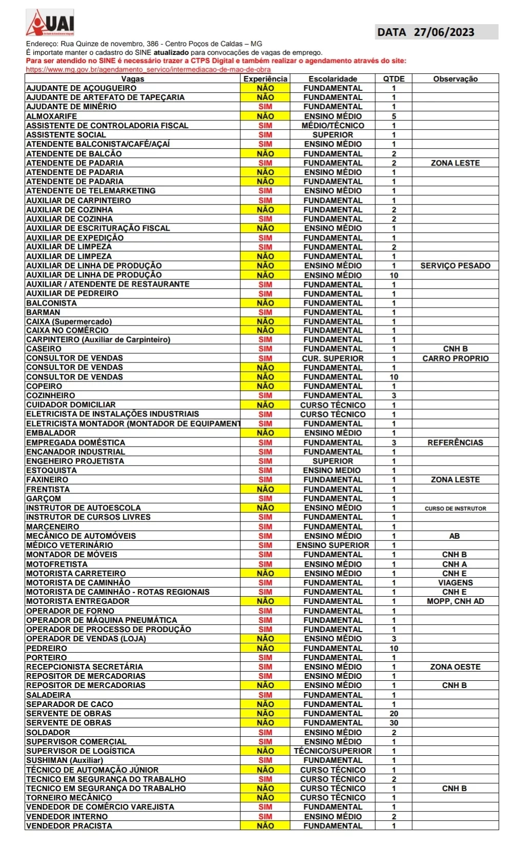 As vagas disponíveis estão no quadro abaixo e podem sofrer alterações ao longo do dia. O Sine fica na rua XV de Novembro, 386.