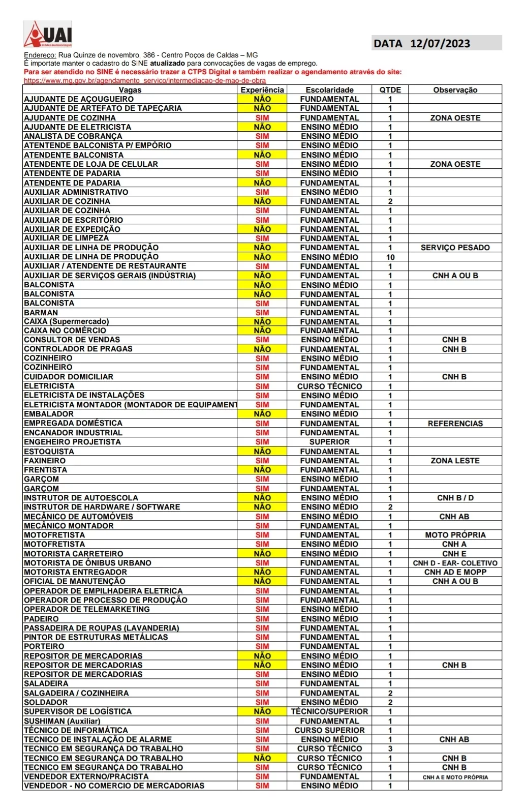 As vagas disponíveis estão no quadro abaixo e podem sofrer alterações ao longo do dia. O Sine fica na rua XV de Novembro, 386.