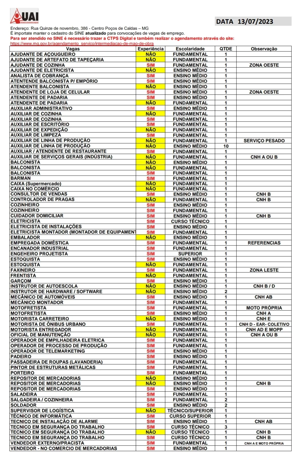 O Sistema Nacional de Empregos (Sine) tem diversas vagas cadastradas para Poços de Caldas nesta quinta-feira (13). Para se inscrever, o candidato deve fazer o agendamento online (clicando aqui).