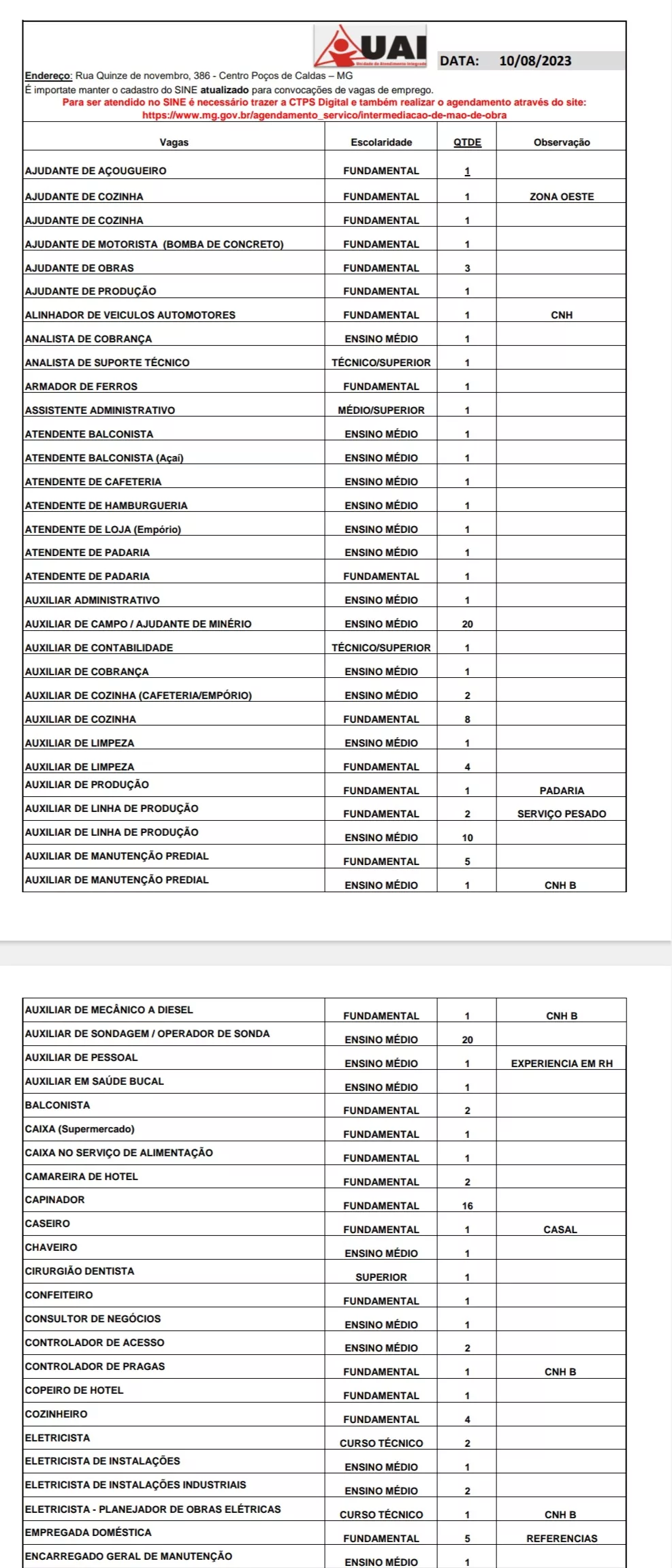 O Sistema Nacional de Empregos (Sine) tem diversas vagas cadastradas para Poços de Caldas nesta quinta-feira (10). Para se inscrever, o candidato deve fazer o agendamento online (clicando aqui).