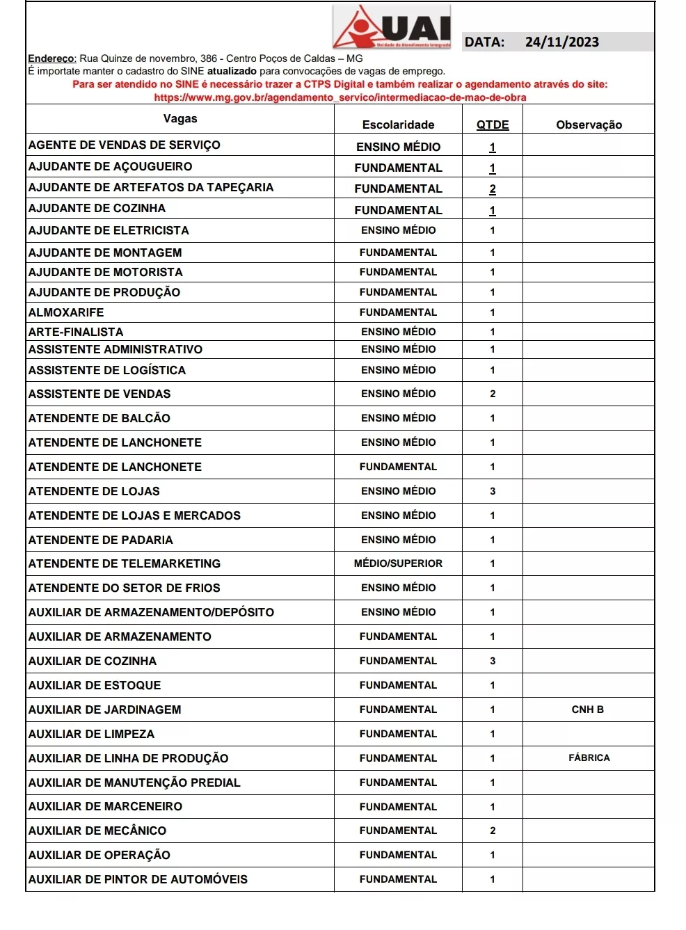 O Sistema Nacional de Empregos (Sine) tem 110 vagas cadastradas para Poços de Caldas nesta sexta-feira (24). Para se inscrever, o candidato deve fazer o agendamento online (clicando aqui).