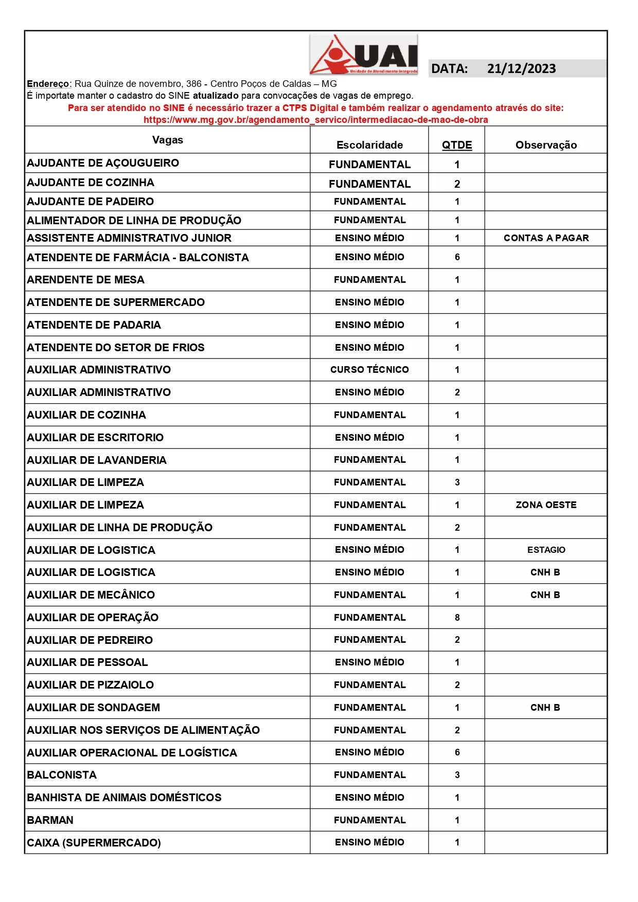 O Sistema Nacional de Empregos (Sine) tem diversas vagas cadastradas para Poços de Caldas nesta quinta-feira (21). Para se inscrever, o candidato deve fazer o agendamento online (clicando aqui).