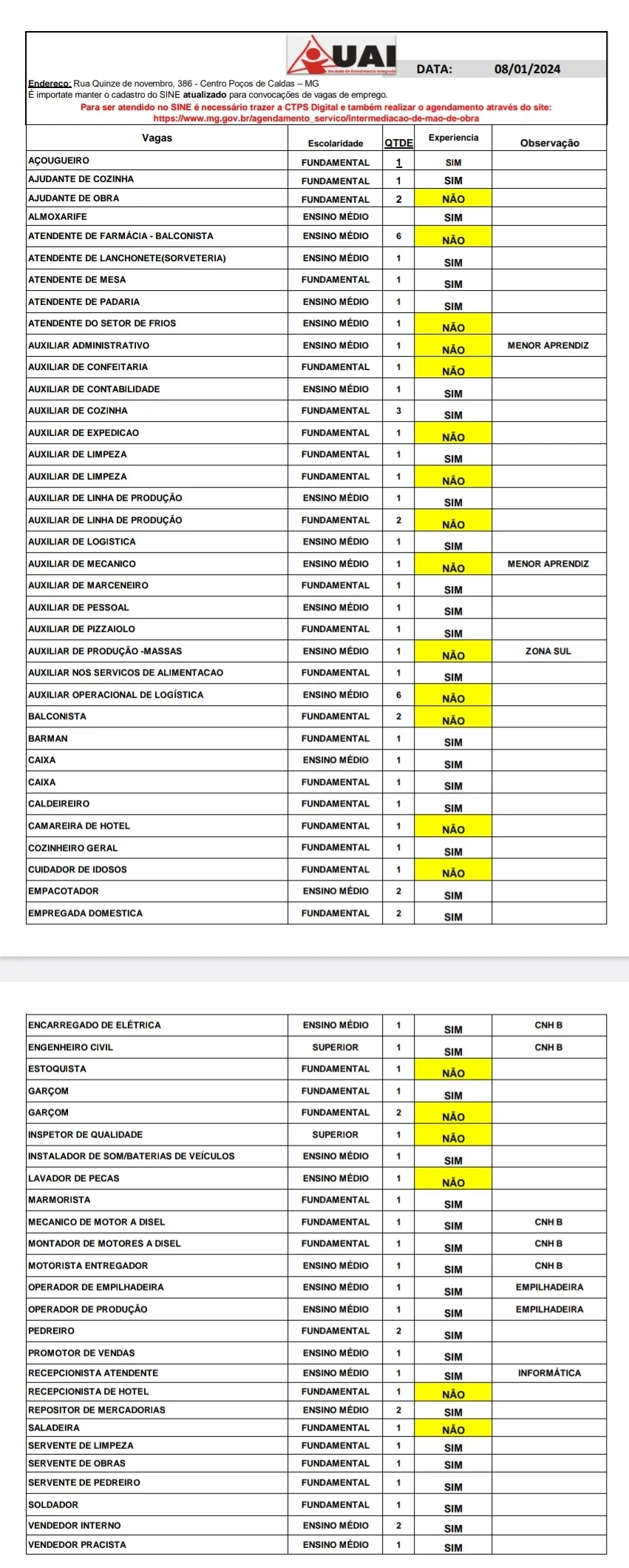 O Sistema Nacional de Empregos (Sine) tem diversas vagas cadastradas para Poços de Caldas nesta segunda-feira (8). Para se inscrever, o candidato deve fazer o agendamento online (clicando aqui).
