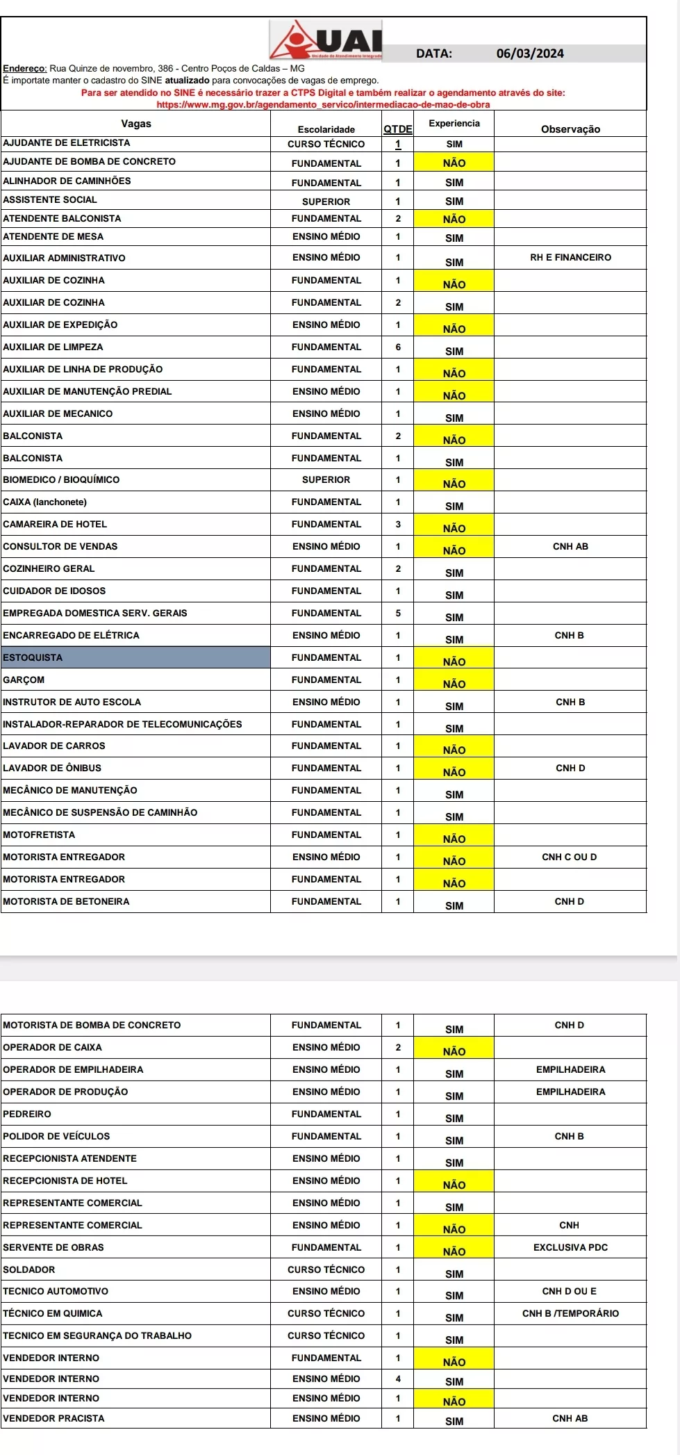 O Sistema Nacional de Empregos (Sine) tem diversas vagas cadastradas para Poços de Caldas nesta quarta-feira (6). Para se inscrever, o candidato deve fazer o agendamento online (clicando aqui).