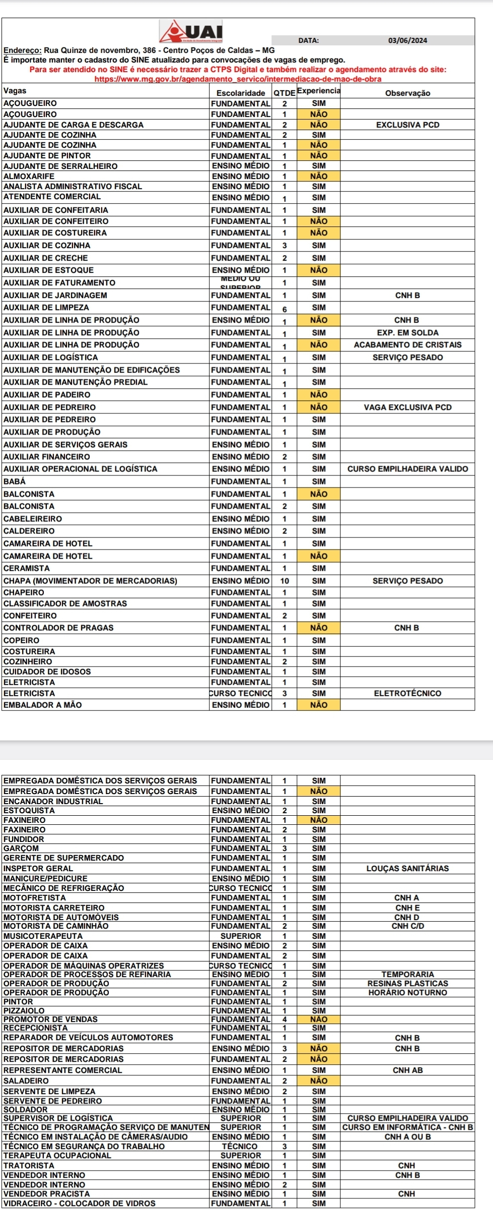 O Sistema Nacional de Empregos (Sine) tem diversas vagas cadastradas para Poços de Caldas nesta segunda-feira (3). Para se inscrever, o candidato deve fazer o agendamento online (clicando aqui).