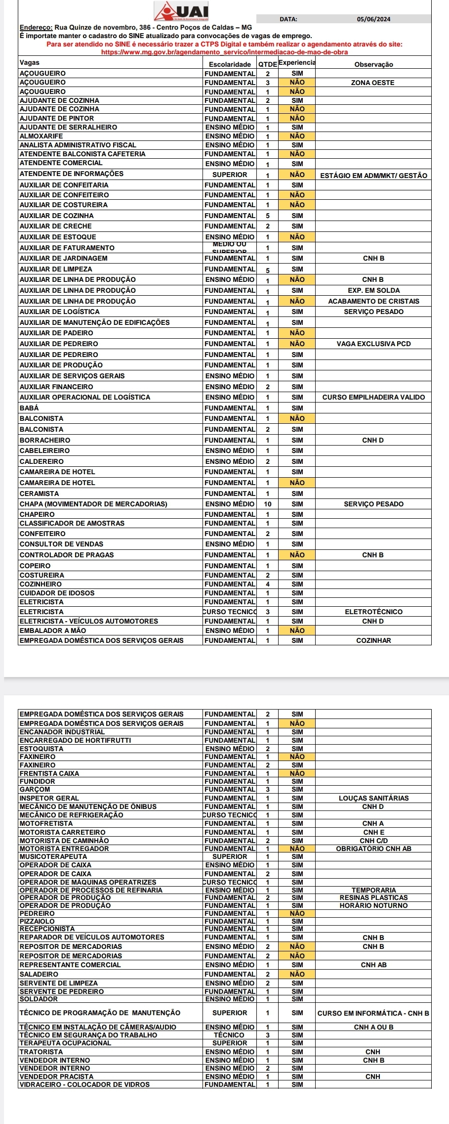 O Sistema Nacional de Empregos (Sine) tem diversas vagas cadastradas para Poços de Caldas nesta quarta-feira (5). Para se inscrever, o candidato deve fazer o agendamento online (clicando aqui).