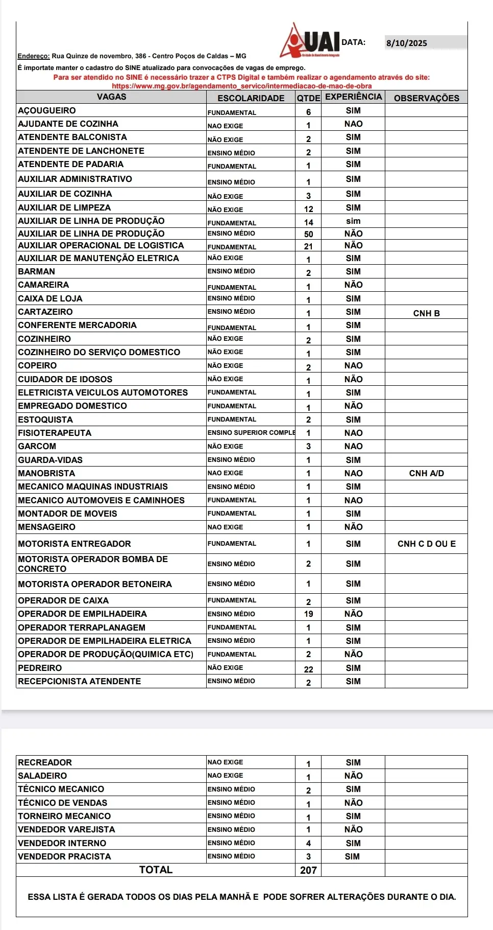 O Sistema Nacional de Empregos (Sine) tem diversas vagas cadastradas para Poços de Caldas nesta quarta-feira (8). Para se inscrever, em qualquer uma das oportunidades, o candidato deve fazer o agendamento online (clicando aqui).