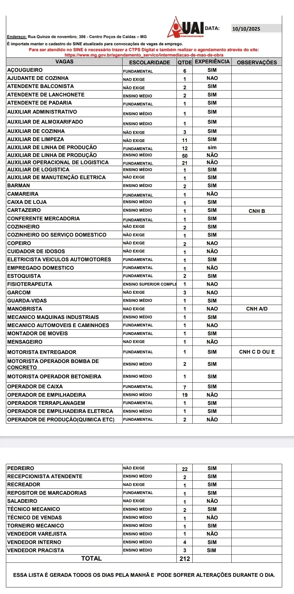 O Sistema Nacional de Empregos (Sine) tem diversas vagas cadastradas para Poços de Caldas nesta sexta-feira (10). Para se inscrever, em qualquer uma das oportunidades, o candidato deve fazer o agendamento online (clicando aqui).