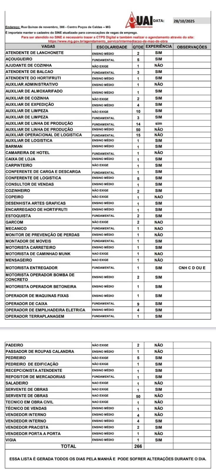 O Sistema Nacional de Empregos (Sine) tem 266 vagas cadastradas para Poços de Caldas nesta terça-feira (28). Para se inscrever, em qualquer uma das oportunidades, o candidato deve fazer o agendamento online (clicando aqui).