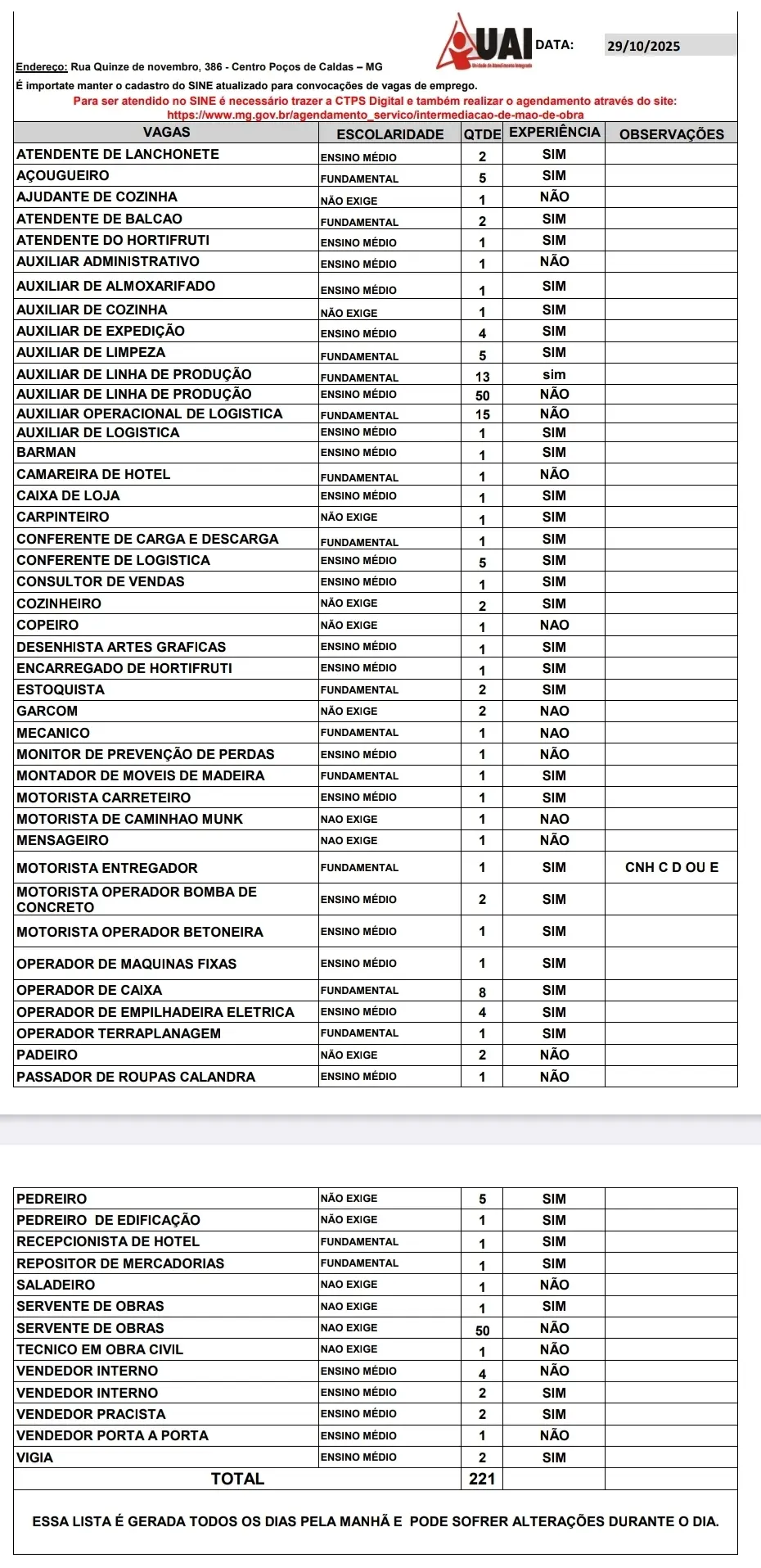 O Sistema Nacional de Empregos (Sine) tem 221 vagas cadastradas para Poços de Caldas nesta quarta-feira (29). Para se inscrever, em qualquer uma das oportunidades, o candidato deve fazer o agendamento online (clicando aqui).